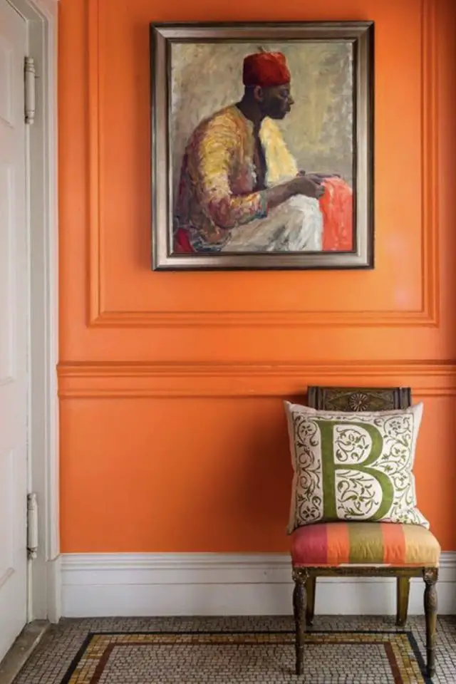 J'aime beaucoup le orange peinture sur les moulures. Cela donne un côté vivant à ce type de décor mural qui est très classique. Plus moderne, on peut créer un soubassement orange et l'associer avec une couleur claire. Le orange peut être en papier peint en haut du mur avec un soubassement plus neutre pour un effet classique. J'aime aussi le orange sur les façades de cuisine. La norme est souvent aux couleurs neutres dans la cuisine et opter pour le orange rend l'espace de vie bien plus accueillant et convivial.