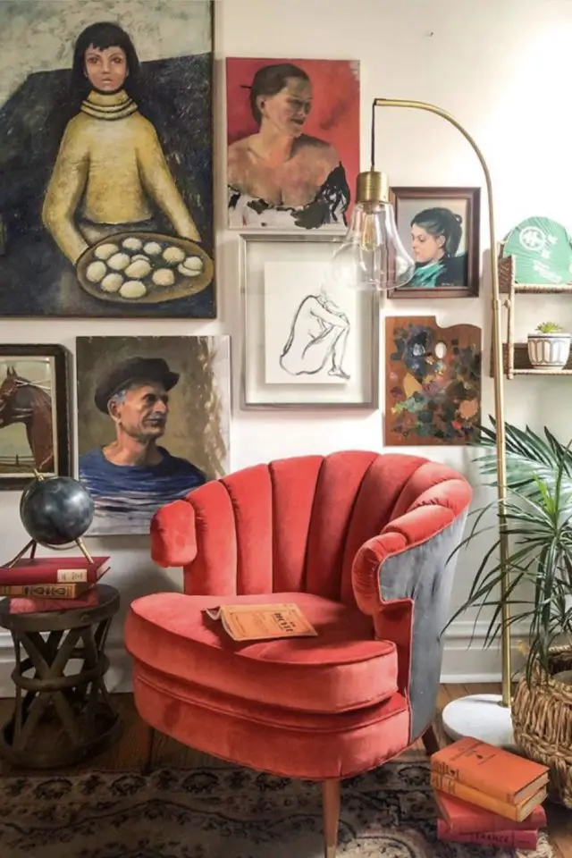 Il y a plusieurs fils conducteurs dans cet intérieur. L'un d'entre eux ce sont les portraits peints. Les tendances sont presque un éternel recommencement et ce qui était à la mode plusieurs décennies auparavant revient. C'est le cas des portraits peints. Je l'évoquais dans mon article à propos des grandes tendances déco de cette année. Et il y en a partout dans ce logement. On les retrouve sur les murs, posés sur un meuble ou une étagère murale. On les trouve unique accompagné de différents objets vintage, on les trouve en galerie sur tout un pan de mur. Ils offrent beaucoup de personnalité au décor en plus de créer une harmonie entre les différents espaces.