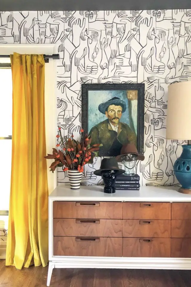 Malgré les mélanges de différentes couleurs, d'époques, d'objets, il y une harmonie grâce à plusieurs fils conducteurs qui se retrouvent dans plusieurs pièces. J'ai parlé plus haut des portraits. Ce n'est pas le seul fil conducteur, il y a aussi la main. Un fauteuil main dans laquelle on s'assied, une main de dessinateur posée sur un meuble, les motifs sur le papier peint. Le tout dans des pièces différentes. On n'est pas sur une harmonie de couleurs, de textures mais sur une harmonie de motif. Alors, c'est possible que la main ne vous parle pas tant que ça. Et ce n'est pas grave. Mais si vous cherchez justement à créer un équilibre dans votre déco tout en préservant le côté personnel, rien ne vous empêche de chercher quelque chose qui vous parle vraiment. Un chat, une référence à la musique, le dessin... que sais-je encore! Ce sont des petits détails qui vous permettront de montrer votre personnalité à travers votre intérieur.