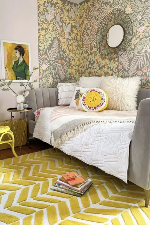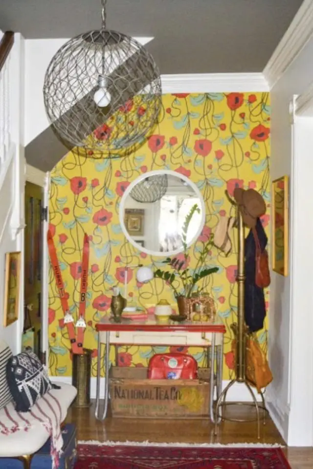 La couleur se retrouve aussi à travers le papier peint. Dans l'entrée, le mur du fond est couvert d'un papier floral jaune joyeux avec une pointe de rouge et de vert. On retrouve aussi dans cet habitat du papier peint effet aquarelle en bleu et blanc qui donne un sentiment plus diffus de la couleur, moins lisse. Au niveau des chambres, il y a un peu plus de sobriété. Dans l'une d'entre elles, on a un papier peint en line art, noir et blanc qui offre une touche moderne (contrastant avec le mobilier et les accessoires vintage). Dans une autre chambre, le papier peint floral est plus doux avec du gris vert et du jaune et permet de mettre l'accent sur l'espace couchage de la chambre d'ami.