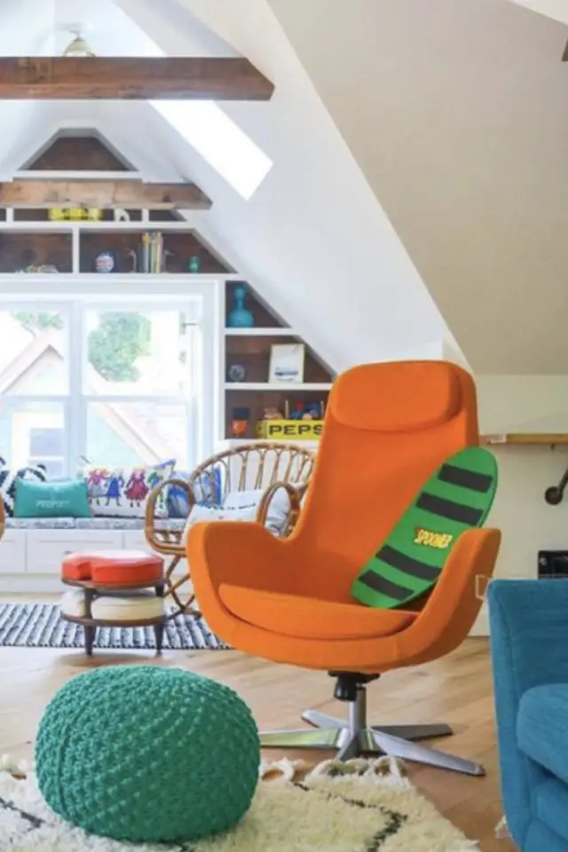 Pour plus de joie et d'éclectisme, la couleur se retrouve aussi à travers le mobilier et les accessoires déco. On a un canapé en velours vert / bleu canard, un fauteuil design vert, un fauteuil vintage orange. D'autres assises sont elles aussi colorées: on a un petit fauteuil rouge (qui me fait penser à un fauteuil crapaud), des tabouret dans la cuisine couleur moutarde. En parlant de jaune, on le retrouve un peu partout dans la maison: le pouf / table basse dans le salon principal, quelques affiches murales, un presse-livre en forme de banane, des coussins, des détails imprimés sur le couvre lit de la chambre parentale, une paire de rideaux dans une chambre, le tapis de la chambre d'ami... Indéniablement, le jaune est une couleur solaire, conviviale, joyeuse. La déco murale, les textiles et tapis, les objets décoratifs disséminés un peu partout sont eux aussi source de couleurs et de bonne humeur.