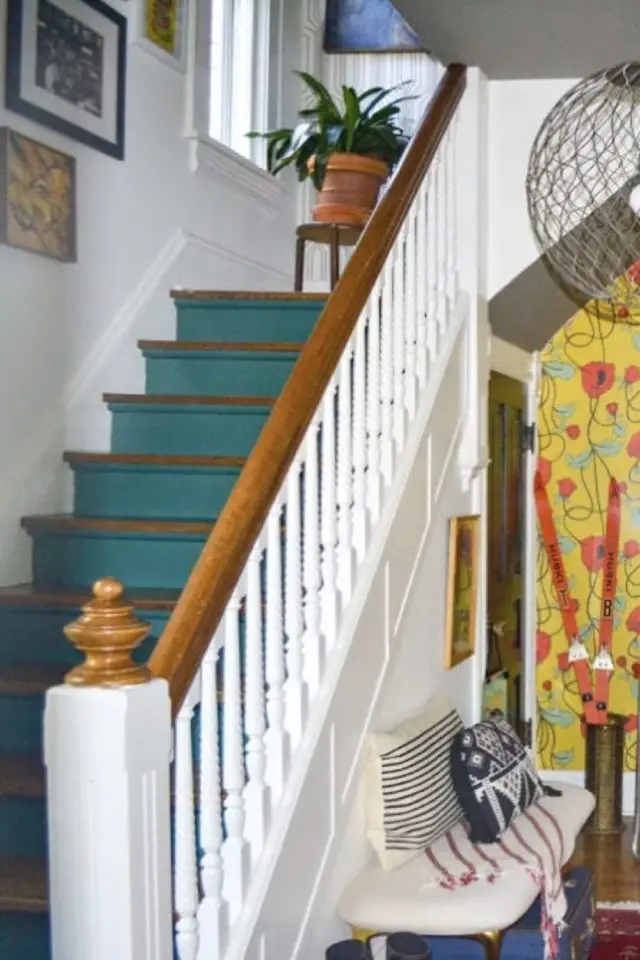 D'abord, la couleur se retrouve grâce à la peinture. La couleur dominante dans la plupart des pièce est le blanc. Et il est dynamisé par d'autres couleurs placées de manières assez étonnantes. Dans l'entrée, ce sont les contre-marches de l'escaliers qui sont peintes. Dans la cuisine secondaire, ce sont les façades des meubles bas qui sont colorées d'un vert franc et vintage. Plus étonnant, dans certaines pièces comme le 2ème salon, c'est le plafond qui est peint de rouge. Mais je crois que ce qui me fait le plus d'effet c'est la peinture dans le salon principal et la salle à manger qui se succèdent. Le salon est peint en bleu. Jusque là, vous me direz, rien de bien ouf ouf ouf. Mais on retrouve cette même couleur dans la continuité (les deux pièces de vie sont séparées par une arche ouverte) dans la salle à manger. Là ce ne sont pas les murs qui sont peints mais le plafond. Le rappel de couleur se retrouve aussi grâce à la vitrine vintage et relookée.
