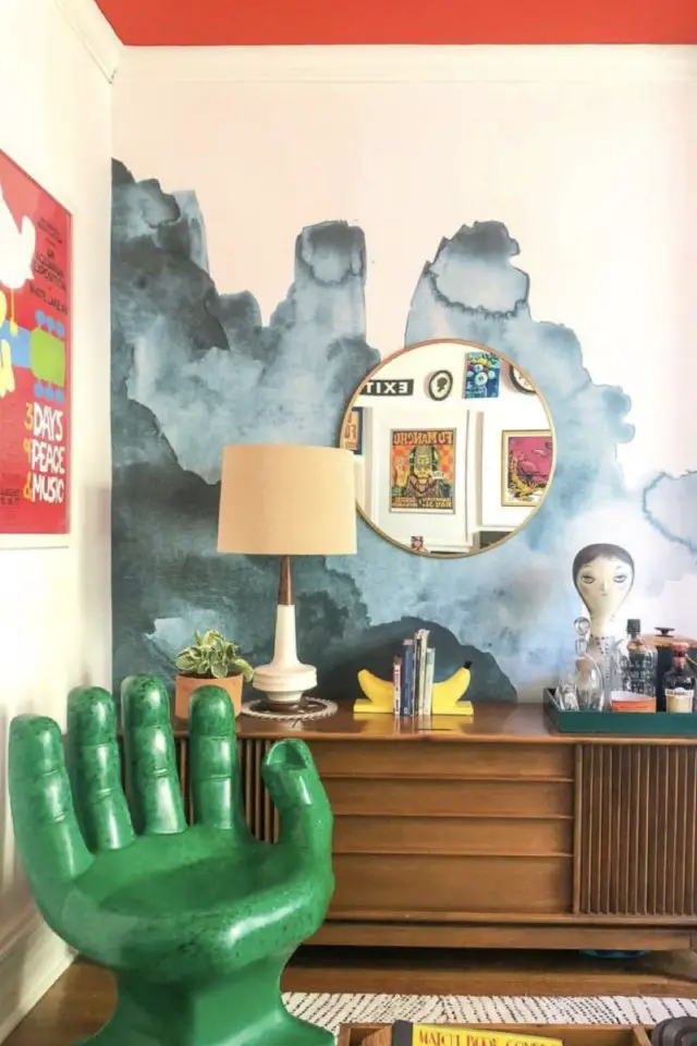 Dans cet intérieur éclectique, il y a aussi des références aux tendances actuelles comme les motifs ethniques dans le salon principal à travers la tenture murale ou les coussins dans le canapé. Il y a quelques objets (comme certains vases et miroirs) qui correspondent à notre époque et qui sont mélangés à des objets bien plus anciens. Cela m'amène à m'intéresser à la juxtaposition de différentes époques: ici, on n'est pas sur un intérieur purement Mid Century Modern ou un décor uniquement seventies. On a des meubles et des objets d'horizons différents. Ce mélange a plusieurs intérêts. En plus de montrer la personnalité de la designer, on a un rythme joyeux et vivant. On n'a pas du tout l'impression de se sentir dans un musée ou un antiquaire. Malgré les références nombreuses à des époques révolues, la designer a réussi à préserver l'ambiance vivante des lieux.