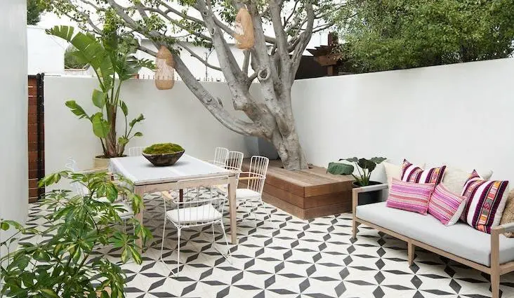 Un sol en carrelage coloré pour délimiter le coin salon en extérieur