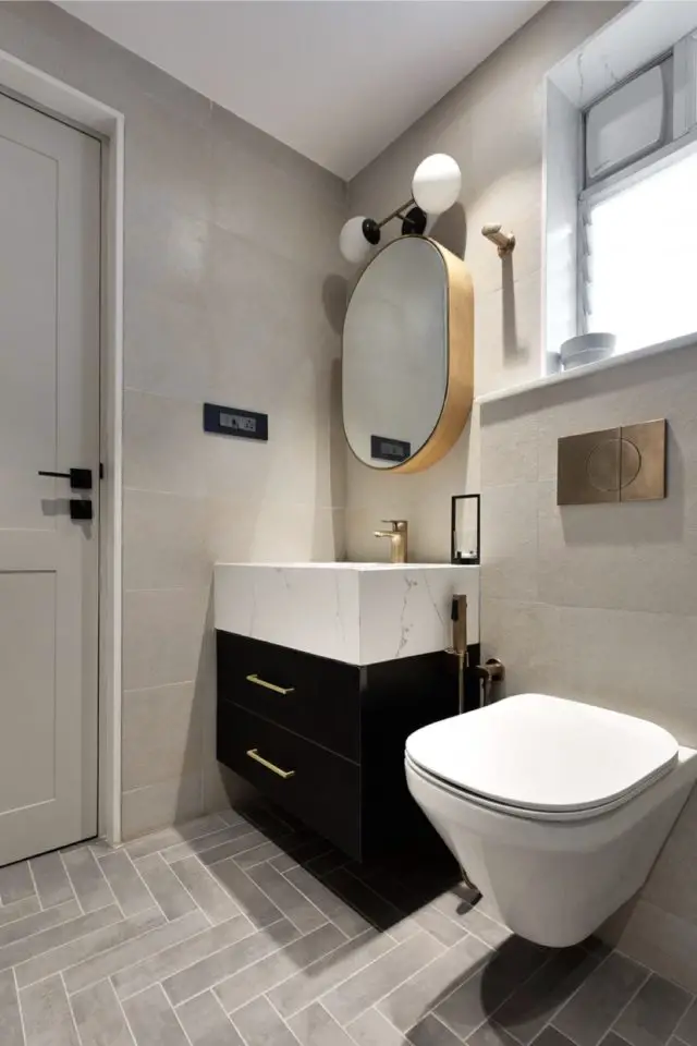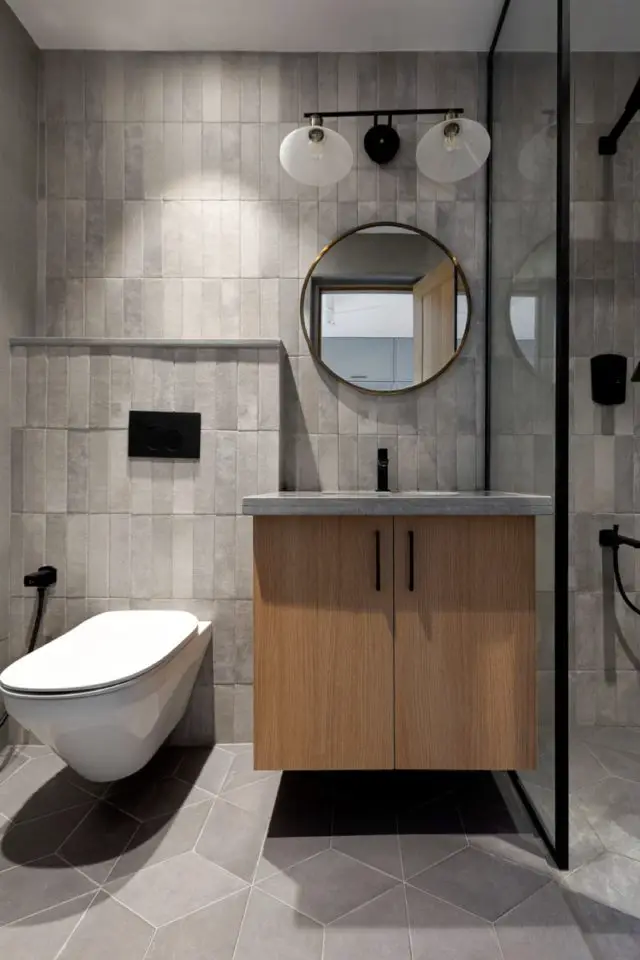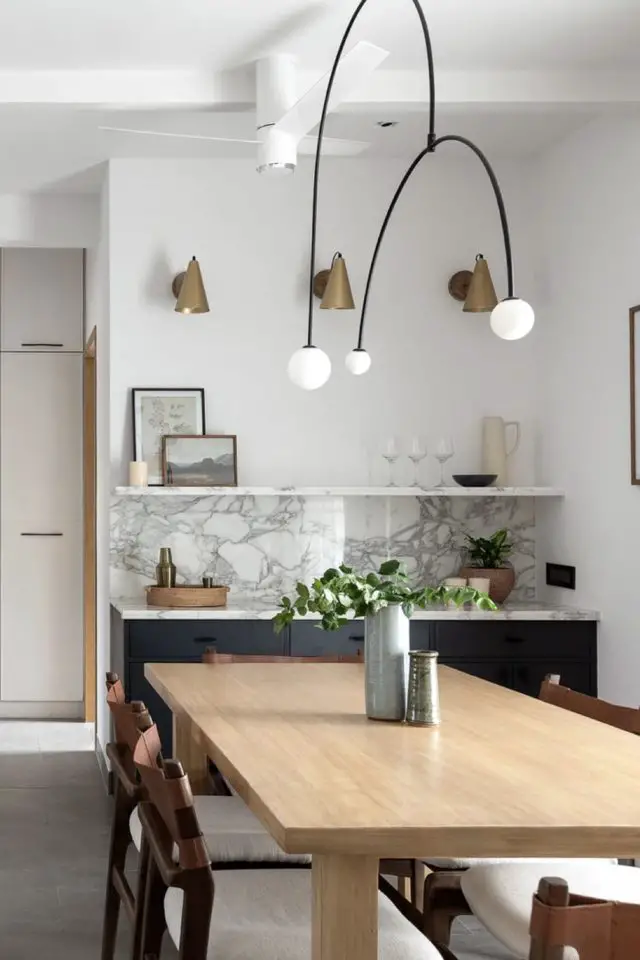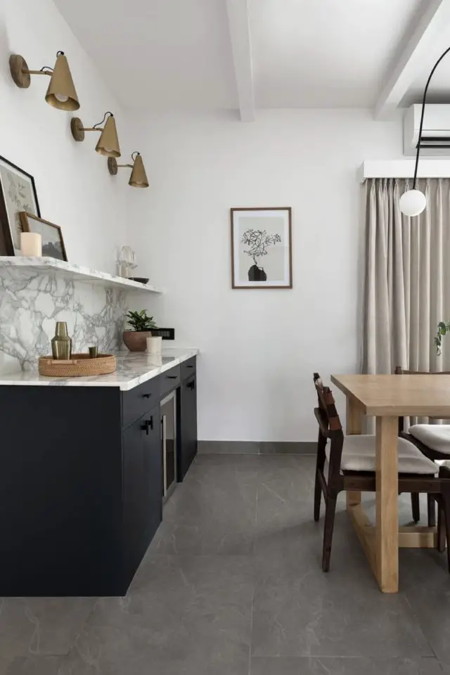 Simple et élégant - Le bois est simple et élégant. Ce n'est pas le seul matériau qui a ses propriétés. On peut prendre l'exemple du carrelage mural comme du carrelage au sol. On a du gris (au sol et au mur), du blanc (au mur). La simplicité des couleurs offre un côté élégant. Cependant, il y a aussi le format, l'apparence du carrelage qui contribue à cette idée de sophistication. Dans l'une des salles de bains par exemple, on a au sol comme au mur, du carrelage gris. Un sentiment de ton sur ton très cosy et très doux. Ce n'est néanmoins pas le même revêtement qui est utilisé. On a un rythme différent au sol (losanges de différentes orientations) et au mur (petits rectangles verticaux) presque imperceptible. Tout en équilibre (encore!) Toujours dans cette idée d'élégance, il y a le dessus du meuble dans la salle à manger qui donne l'impression qu'on est dans la cuisine avec plan de travail et crédence: en marbre blanc et gris clair. Une touche plus glamour, plus chic qui va dans la continuité des appliques murales en laiton doré qui les surplombent.