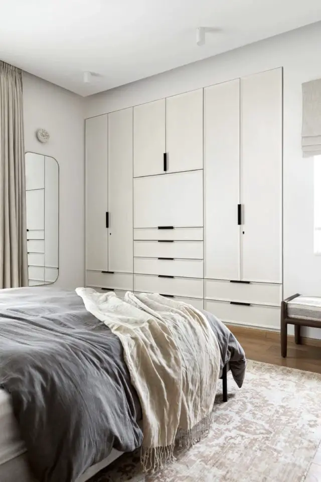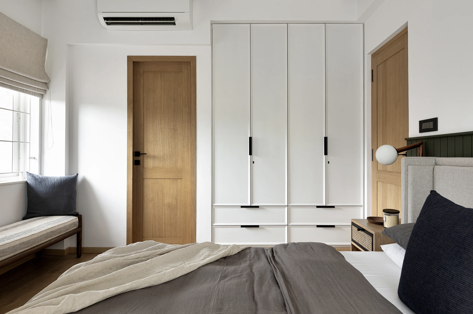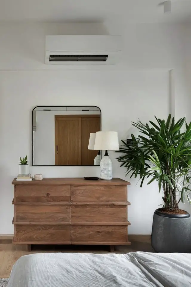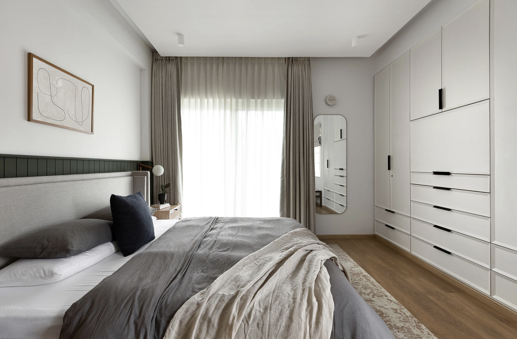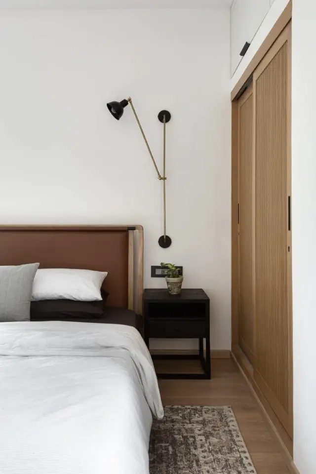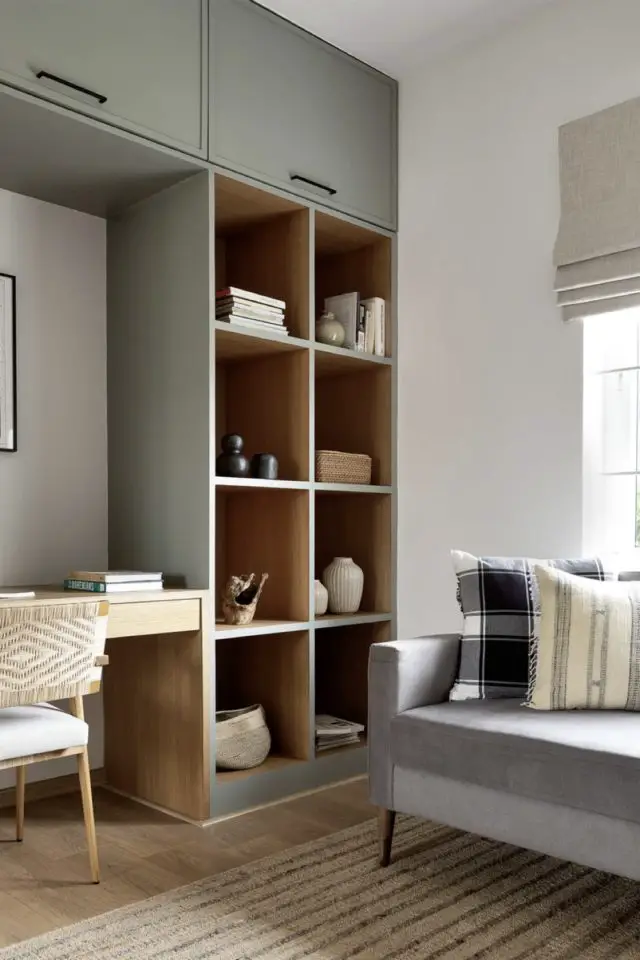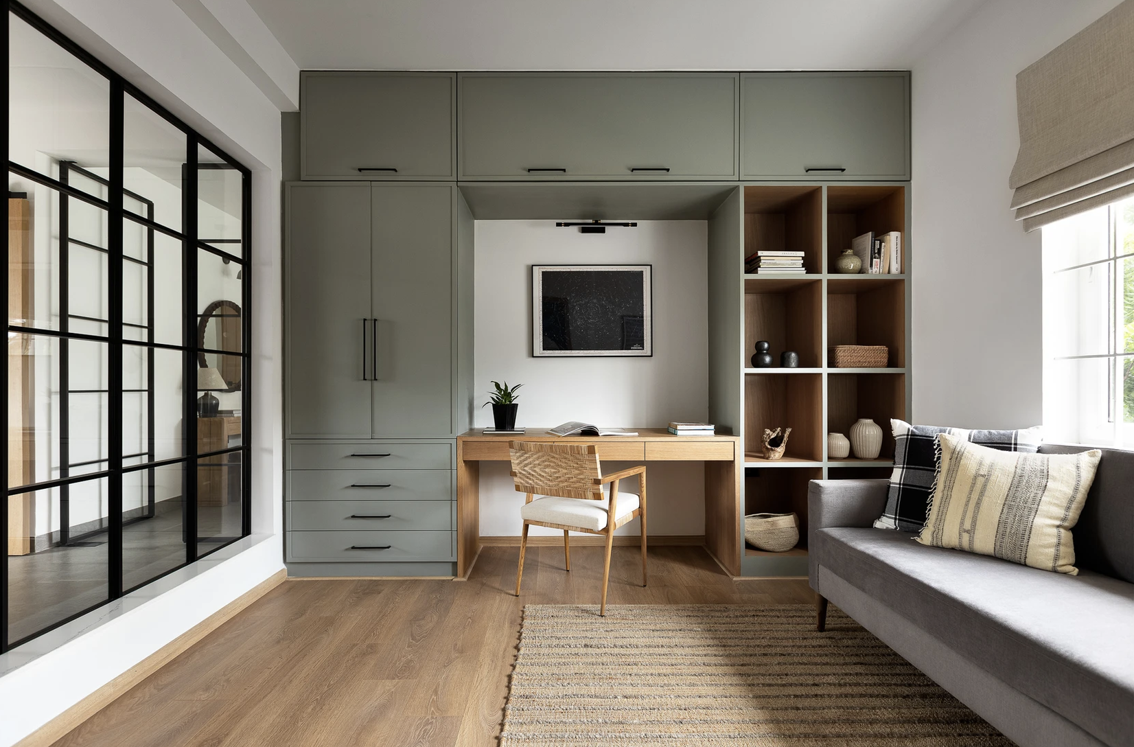Je ne pensais pas avoir autant de choses à vous raconter pour cette visite déco. C'est un coup de coeur et donc je suis assez loquace. Je ne peux pas terminer cet article sans parler des meubles sur mesure. C'est une thématique que je n'aborde pas si souvent parce que je préfère la déco et le mobilier qui est accessible au plus grand nombre. Le sur-mesure a un coût que tout le monde ne peut pas se permettre. Dans des intérieurs minimalistes voire slow, le sur-mesure a beaucoup de sens. On crée suffisamment de rangements pour ne pas avoir le sentiment d'être envahi(e) par les objets du quotidien. On crée des meubles qui correspondent en tout point aux dimensions disponibles dans la pièce (et donc l'espace est optimisé). Le sur-mesure permet aussi un plus large choix de matériaux et donc une meilleure homogénéité dans la pièce. Dans ce logement de Chennai, le mobilier sur-mesure se retrouve dans différentes pièces. Il y a les meubles / penderies / dressings des chambres. Il y a aussi le meuble bureau que j'aime particulièrement. Dans la chambre, le sur-mesure tend à faire oublier le meuble alors que dans le bureau, il donne la fonction à la pièce. Un meuble sur tout un pan de mur qui mixe espace de travail et rangement, qui mélange bois et couleur vert sauge.