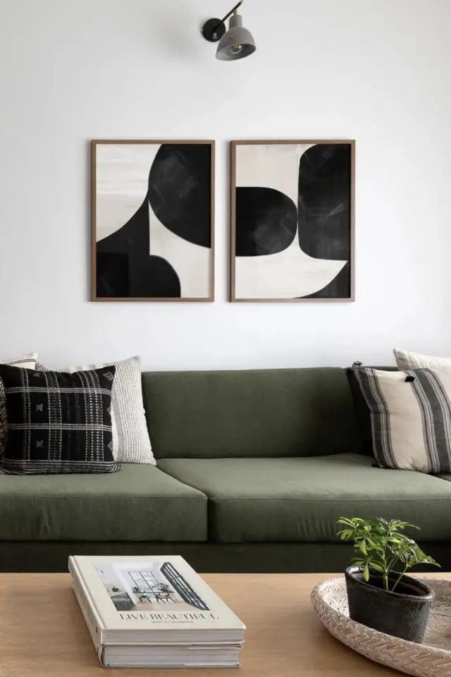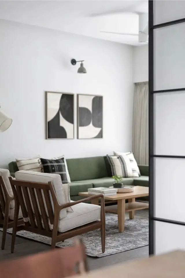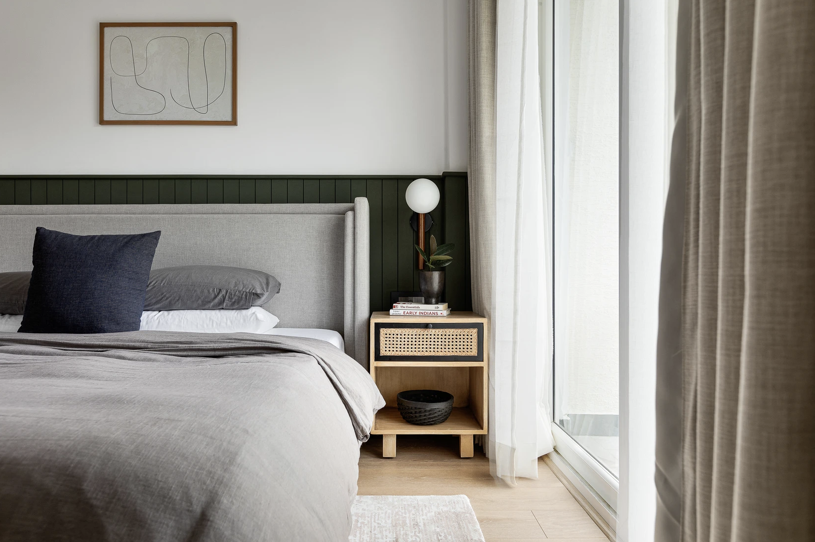 Si vous suivez le blog, vous savez que j'ai un certain penchant pour le vert et donc vous comprenez vite pourquoi j'ai eu un coup de coeur pour ce logement et pourquoi j'ai eu envie de le partager ici avec vous! Il y a différentes nuances de vert mais elles ont toutes un point commun: ce sont des nuances modernes, complètement dans l'air du temps. En plus, je trouve que l'utilisation de ces verts est tellement équilibrée. Il y a juste ce qu'il faut de couleur pour dynamiser les espaces et profiter pleinement des vertus relaxantes d'un vert sauge ou d'un vert plus sourd. D'ailleurs, ce vert sourd tend plus au kaki (ce qui est drôle puisque la couleur kaki est d'origine indienne!). Les couleurs sourdes sont parfaites pour créer un sentiment d'intimité. Et ce vert kaki est utilisé dans la chambre (l'un des espaces où l'intimité est intrinsèque). Et pour la question de l'équilibre, le kaki est en soubassement, partiellement caché par la tête de lit grise. La couleur n'a rien d'étouffant, rien d'oppressant. Un parfait équilibre.