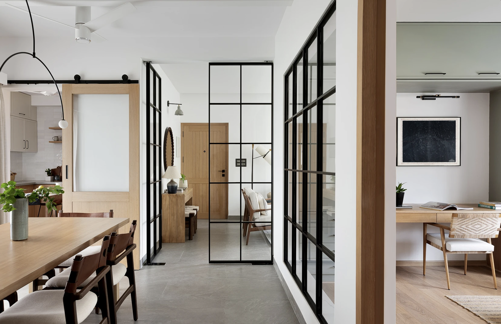 Pratique - Enfin, il y a un aspect pratique dans les matériaux choisis. Le carrelage est pratique d'entretien mais ce n'est pas vraiment ce côté fonctionnel qui m'intéresse. C'est plus le verre que l'on retrouve notamment sous la forme d'une grande verrière moderne (pour séparer le bureau et la salle à manger). On retrouve ce même esprit entre la salle à manger et le salon avec grande porte vitrée à deux battants. On a l'impression que tous les espaces de vies communiquent entre eux, qu'ils sont ouverts les uns sur les autres - mais pas totalement. L'utilisation du verre en grande quantité comme cloison et comme porte permet à la lumière naturelle de se diffuser dans les différents espaces.