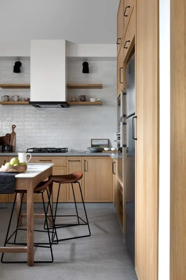 Naturel - Le bois est le matériau qui saute aux yeux au premier abord. Il se trouve un peu partout: en grande quantité dans la cuisine, dans la salle à manger aussi à travers la table de repas et les chaises qui l'entourent. Dans le salon sous différentes essences qui elles aussi rythment la pièce et apportent un sentiment de vie. La plupart des portes entre les pièces sont elles aussi en bois. Il est omniprésent.