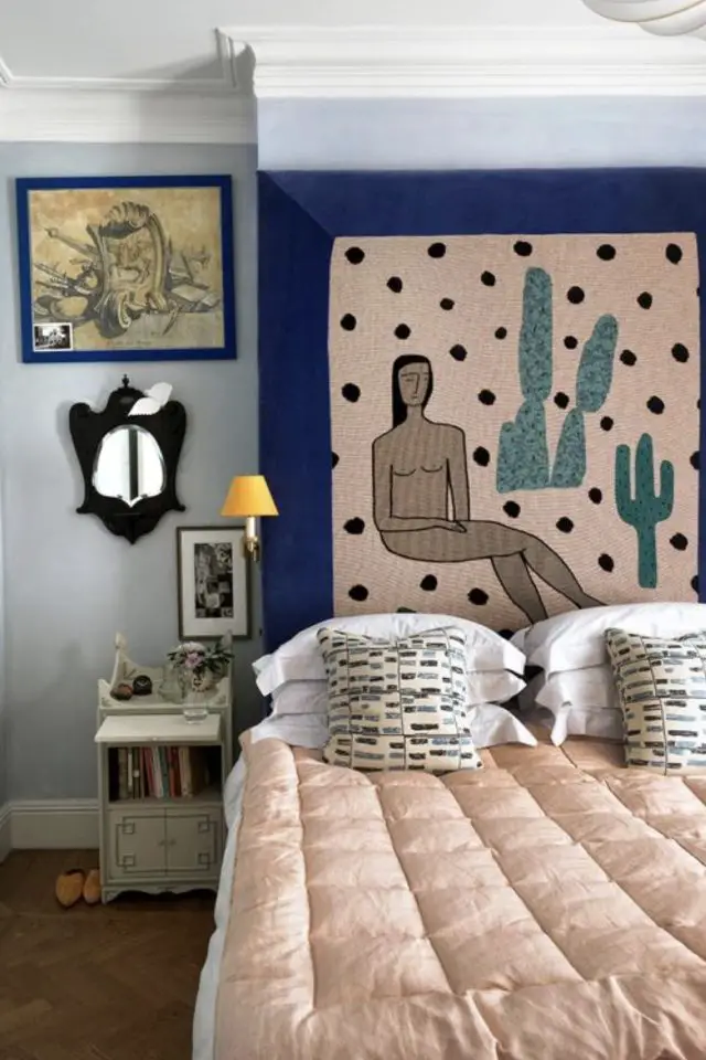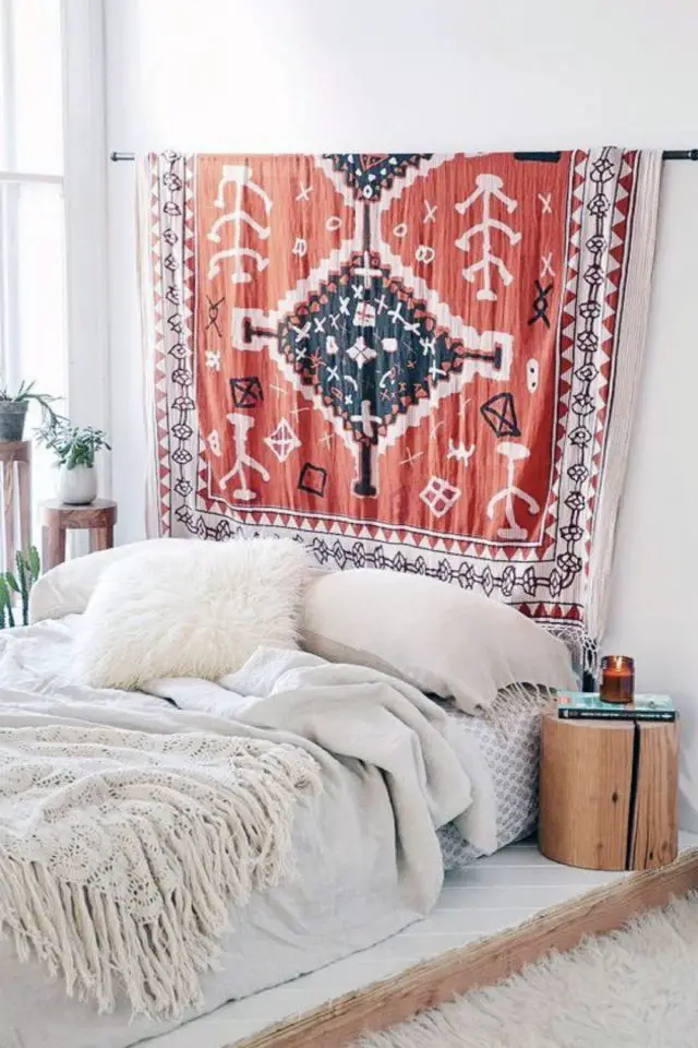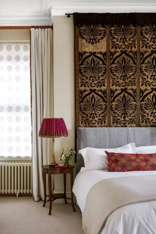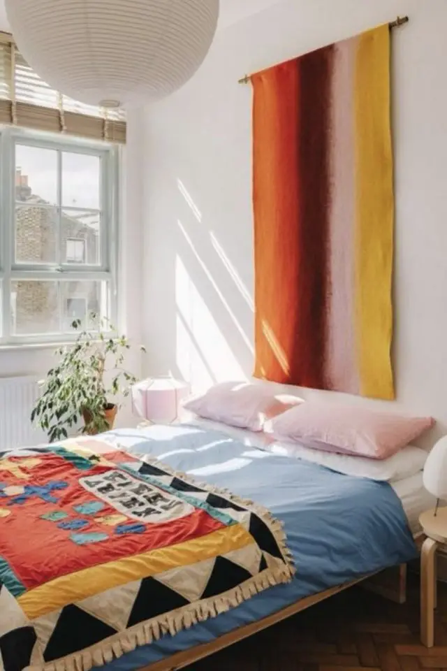 C'est probablement la solution que je préfère dans cet article. C'est facile et rapide à poser, ça ne demande pas de percer 36 trous dans le mur. J'aime aussi beaucoup l'idée de décorer le mur avec des textiles. Comme on est à proximité immédiate du lit, les tentures et tapisseries textiles créent un effet de prolongement assez cosy sur le mur. Et troisième point qui me parle: elles apportent couleurs et motifs. C'est top dans une chambre unie dans une couleur neutre. En quelques instants, la tenture va apporter une nouvelle dimension à votre déco de chambre.