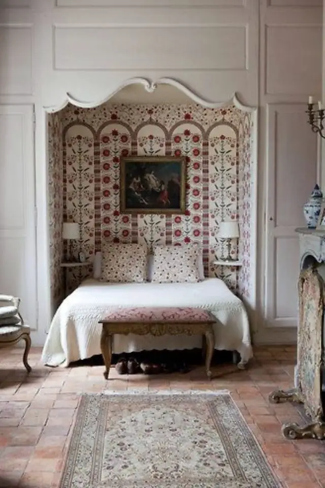 Je reste dans l'idée de papier peint mais cette fois à l'intérieur d'une alcôve. Qu'est-ce qu'une alcôve? C'est un renfoncement dans un mur dans lequel on vient placer le lit ou du moins la tête de lit. L'alcôve offre un caractère très cosy à l'espace sommeil presque à l'image d'un cocon dans lequel ont viendrait dormir.