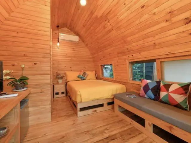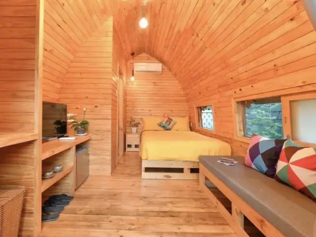 Ce n'est pas du tout le logement de vacances le plus design mais il m'a fait un peu penser à l'idée de glamping que j'ai pu vous faire découvrir dans d'autres pays d'Asie. Il y a une certaine simplicité dans le logement. On est sur l'idée d'essentiel pour profiter de ce que la nature a à nous offrir. La nature ou la piscine d'ailleurs! Si vous lisez régulièrement le blog, vous savez que je suis une grande fan de la simplicité sous toutes ses formes. Cela explique pourquoi j'ai sélectionné ce bungalow. Autre raison: la forme du bungalow que je trouve originale. Ca change des bungalow effet chalet ou She Shed. J'aime bien le côté cintré et la rondeur qui en découle. C'est différent et cosy.