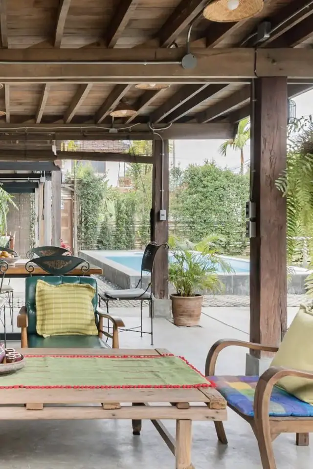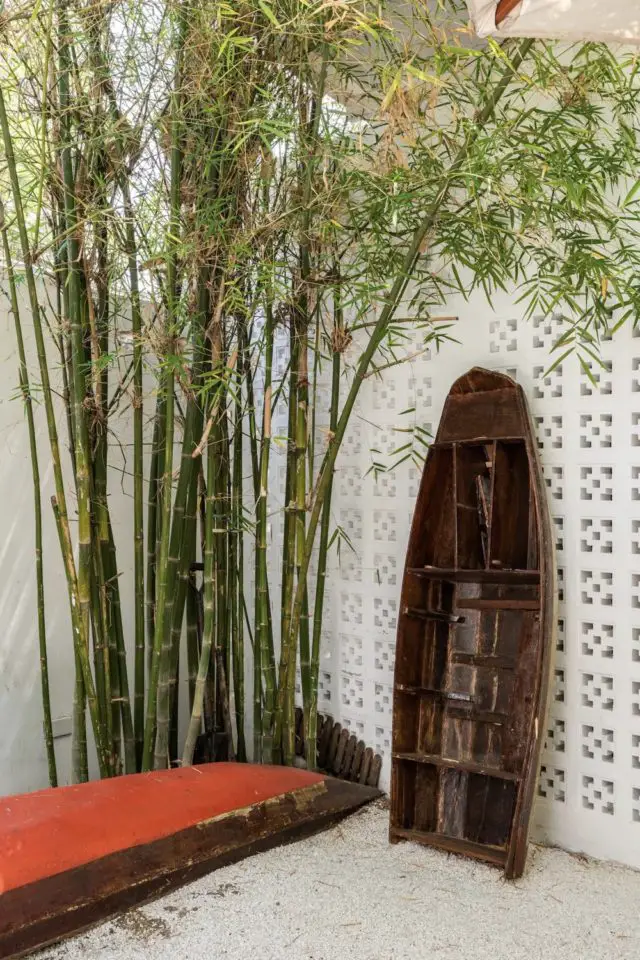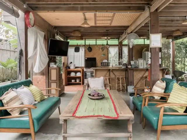 Le jardin extérieur de cette maison d'exception est lui aussi plein d'étonnement: une jolie piscine privée, des plantes exotiques, des terrasses couvertes qui vous protègent du soleil et une passerelle pour aller d'une partie de la maison à une autre. Vous trouverez aussi un espace bar avec un toit en feuilles de palmiers, un jardin verdoyant avec une petite plateforme sur-élevée et protégée.