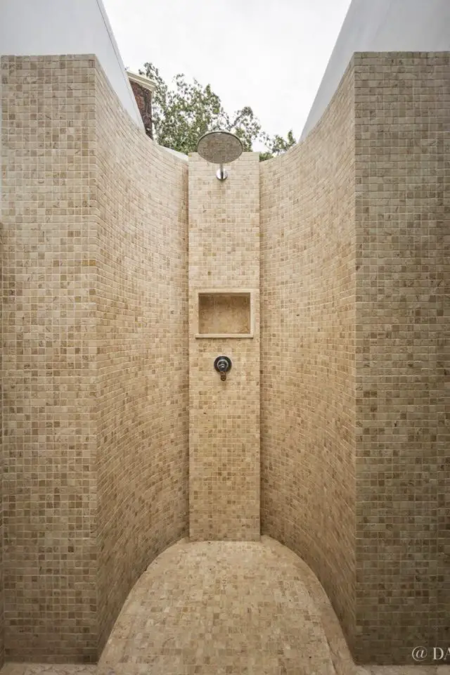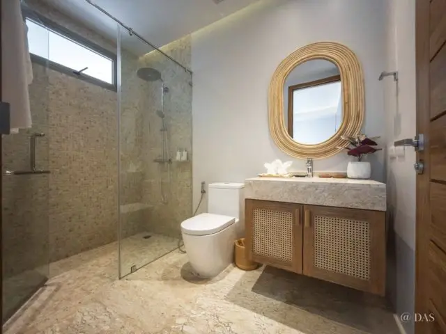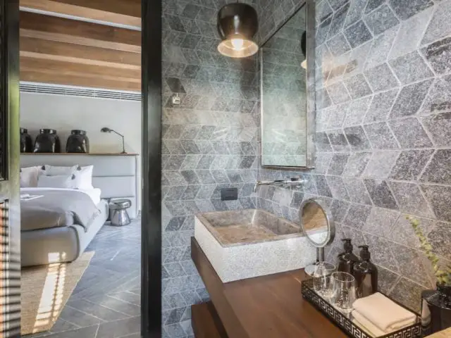Pour l'inspiration, je vous invite à regarder de plus prêt les salles de bain de cette villa. Elles sont simples et chic à la fois. On y retrouve des courbes et une luminosité très French Riviera.