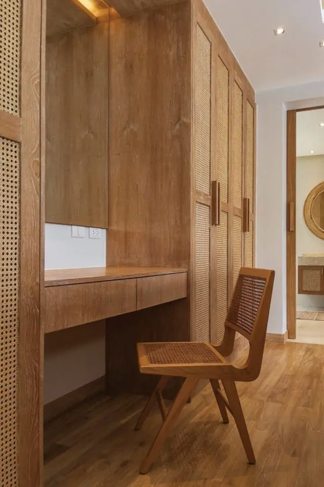Comme ici, ce qui m'intéresse c'est l'aspect déco plein de douceur à l'intérieur. Du blanc en large proportion, des matériaux naturels comme le bois, le rotin, la jute ou encore le cannage. J'aime (vraiment) beaucoup les dressings sur-mesure avec leurs portes en cannage et bureau intégré. J'aime aussi dans l'une des chambres la tête de lit (elle aussi en cannage) qui fait office de séparation avec le dressing. Une jolie manière d'apporter de la structure dans la pièce sans pour autant cloisonner et perdre la sensation d'espace.