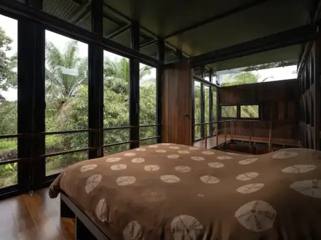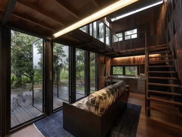 D'un point de vue esthétique, cette maison est mon autre coup de coeur. J'aime l'idée de construction en communion avec la nature. C'est un esprit très biophilique que j'affectionne particulièrement. Le bois de la cabane fait écho à la nature environnante. Les nombreuses baies vitrées permettent de profiter du paysage même à l'intérieur (même depuis le lit).