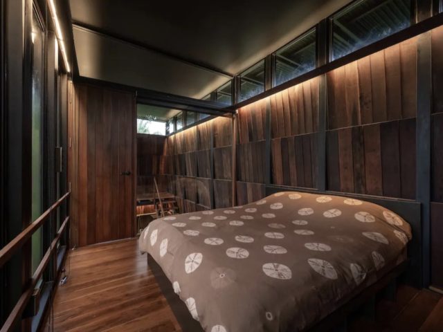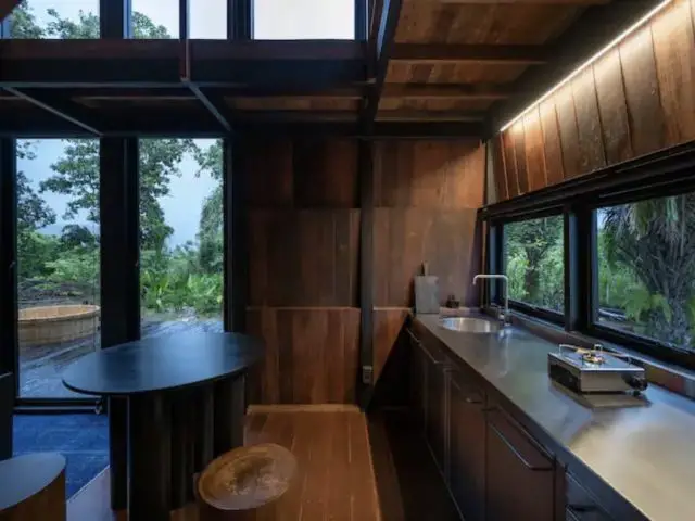 Découvrir un pays c'est aussi découvrir son architecture. C'est pour cela que je tâche dans chacune de mes sélections de vous proposer quelques logements touristiques traditionnels. Ici, la démarche est différente. On est sur une construction moderne, la Wood and Mountain Cabin a été réalisée pour associer artisanat et techniques expérimentales de construction. Par exemple, pour protéger le bois de la cabane, c'est la technique Shou Sugi Ban qui a été privilégiée. Elle consiste à sélectionner avec soin les panneaux de bois et les bruler. Cette technique traditionnelle japonaise offre une texture unique au bois, les veines du matériau sont mises en avant. Cela n'a pas que des avantages esthétiques, elle rend le bois plus solide et plus résistant.