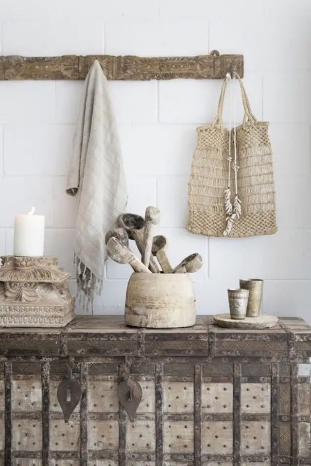 Pour créer un intérieur imparfait, il y a deux catégories d'objets qui vous aideront. D'une part la récup'. C'est parfait pour le mobilier qui a déjà vécu et qui montre l'effet du temps. Les meubles en bois patinés: la table de salle à manger, le banc au bout du lit, le buffet dans le séjour. Les possibilités sont nombreuses. D'autre part, on va aussi piocher dans l'artisanat, ce qui est fabriqué à la main et donc pas nécessairement parfait. Des objets qui ne sont pas parfaitement identiques. Cela marche très bien pour tout ce qui est vaisselle, vases et pots de fleurs, petits objets décoratifs. Ca marche aussi pour les textiles tissés à la main. Vous pouvez par exemple choisir une grande tenture artisanale pour décorer l'un des murs du salon.