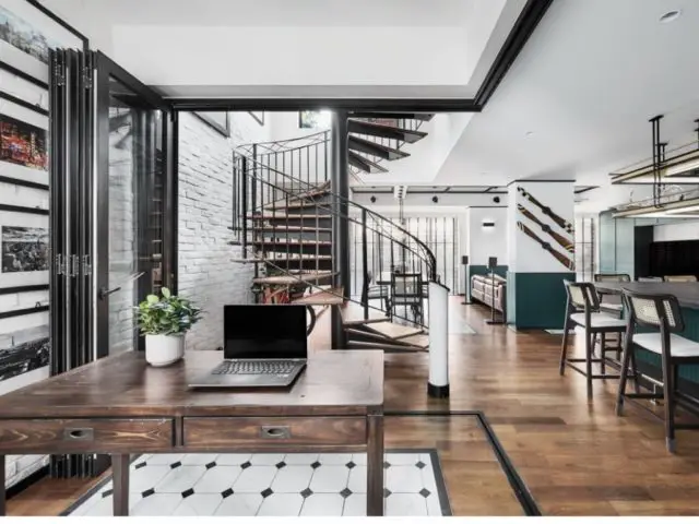 D'abord, on retrouve cette idée de style industriel dans une dimension structurelle. L'escalier en colimaçon en bois et en métal noir aurait pu tout à fait avoir sa place dans une usine du nord de la France. Toujours dans cette idée de références industrielles surannées, on a tout ce qui est relatif à l'esprit verrière: de grandes baies vitrées qui donnent sur l'extérieur, des cloisons et portes vitrées entre les pièces ou encore l'installation de miroirs au dessus de l'espace salon pour mettre en valeur les volumes différents du plafond. Tout ceci est mis en valeurs par de grands montants noirs et donc une géométrie qui nous renvoie à l'époque industrielle.