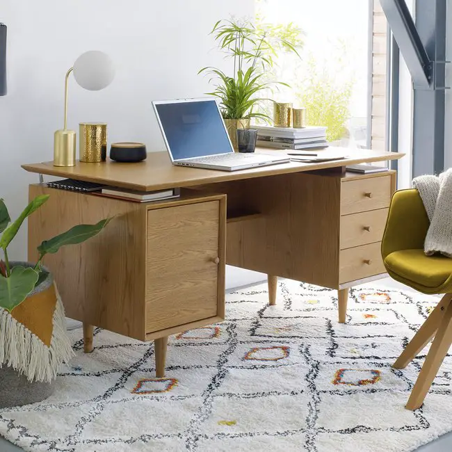 Travailler depuis chez soi, c'est aussi esquiver l'ambiance impersonnelle d'un bureau partagé en extérieur. C'est donc l'opportunité de créer un espace cosy et chaleureux. La couleur va vous aider dans cette démarche. Vous pouvez aussi créer une atmosphère plus chaude grâce au mobilier en bois. Les essences sombres offriront à votre bureau un petit côté vintage en plus. C'est bien d'avoir un espace qui a du cachet aussi. Comme dans une chambre ou une pièce de vie, si vous cherchez à accentuer le côté cosy de la pièce, rien ne vous empêche d'ajouter un grand tapis.