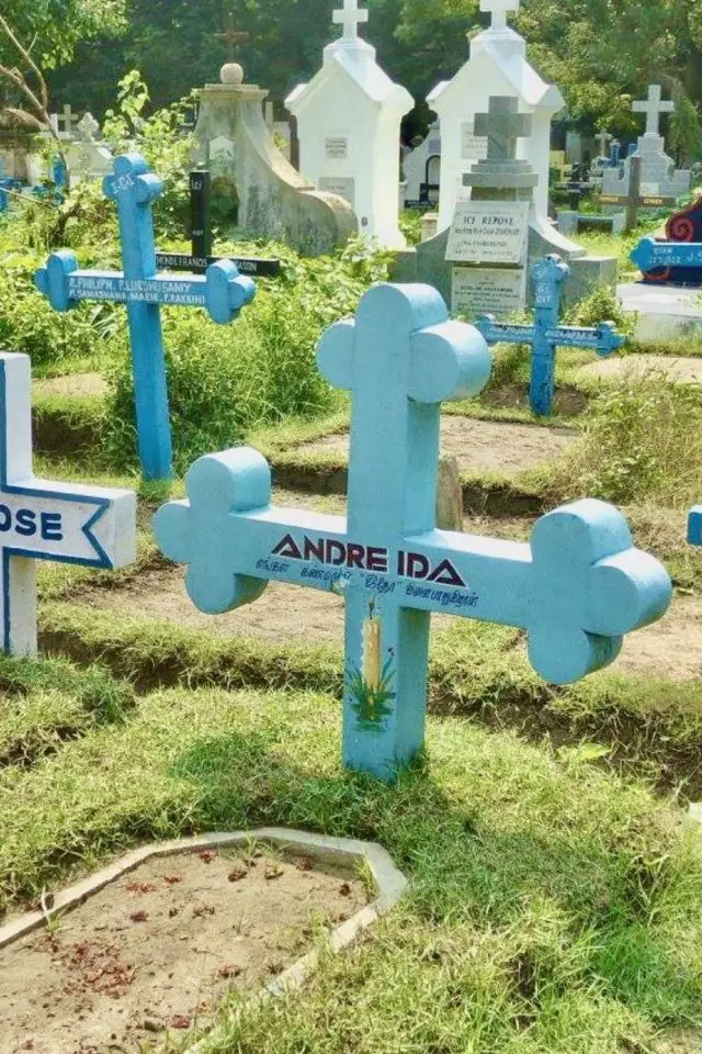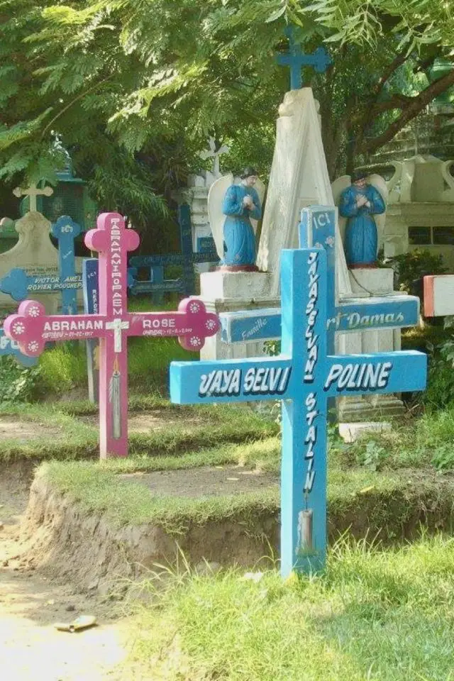 Un peu excentré se trouve le lieu que je préfère à Pondicherry: le cimetière français et en face le cimetière anglais. Prenez un tuktuk pour y aller, c'est un peu loin (on l'a fait à pied... on peut vous assurer que ça fait un bout). Le cimetière anglais est très anglais. De vieilles sépultures, de la végétation partout. Le cimetière français est haut en couleurs. C'est très différent de ce que l'on trouve en France. Et c'est assez sympa de regarder les noms qui s'y trouvent. Je vous en parle ici.