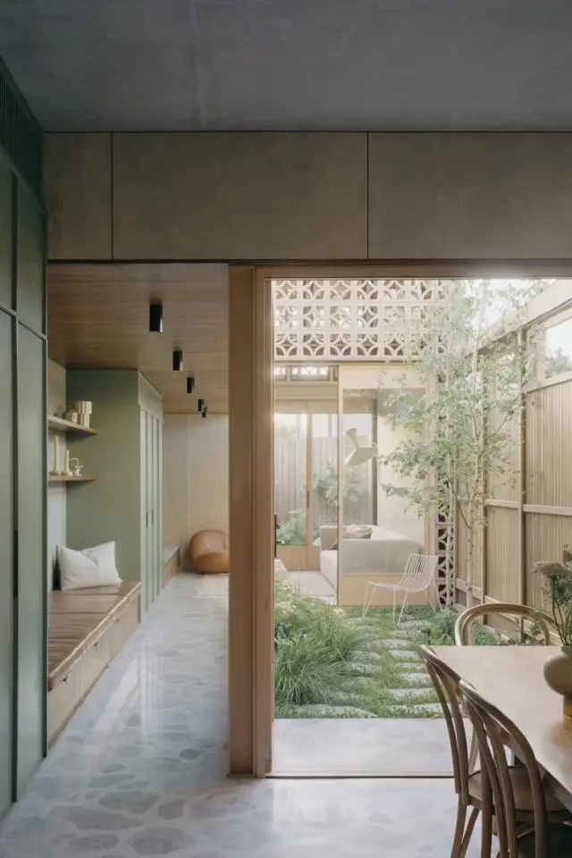 Pou rester dans la thématique de l'extérieur, entrons dans la cour. C'est un patio qui est entouré par les pièces de vie. On peut profiter du jardin même en étant à l'intérieur grâce à de grandes baies vitrées. Les menuiseries extérieures sont de la même couleur que les claustras, une sorte de beige sable, ce conforte l'harmonie entre dehors et dedans. Par moment, les claustras sont comme une double cloison, une enveloppe extérieure. De dehors, on ne voit pas les grandes fenêtres pourtant elles sont bien présentes. Le découpage des claustras laisse passer la lumière naturelle à l'intérieur et les fenêtres assurent - entre autre - un certain confort notamment au niveau de la température de la maison.