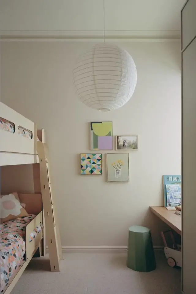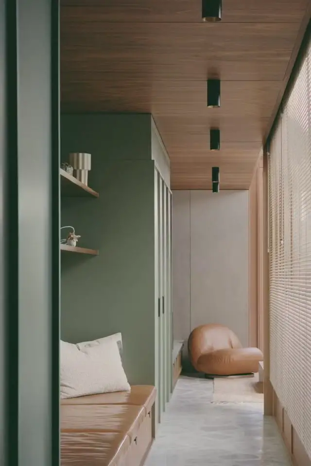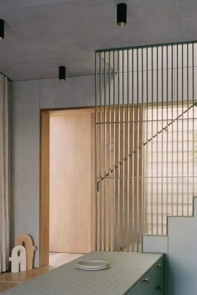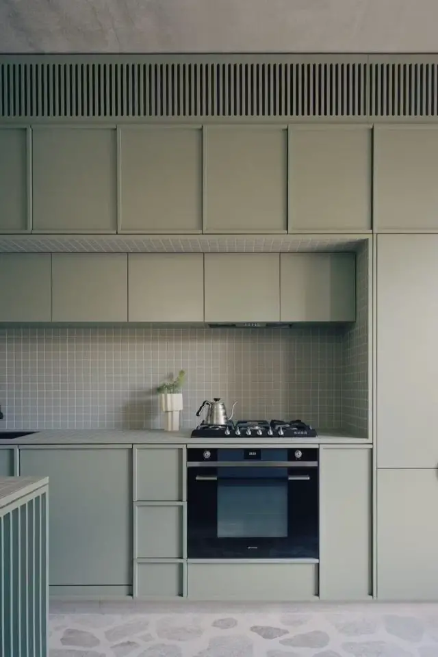 Le vert sauge clair accompagne le bois. On reste sur une palette de naturel ici. Le vert sauge est un mélange de vert et de gris ce qui lui confère une extrême douceur. Sa tonalité claire permet à la lumière de circuler mais aussi de créer un tendre effet cocon. Bien plus discrète, une pointe d'écru met en valeur certains éléments comme l'îlot de cuisine. L'écru se retrouve en plus grande quantité dans les espaces plus privés comme la chambre des enfants.