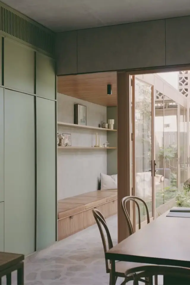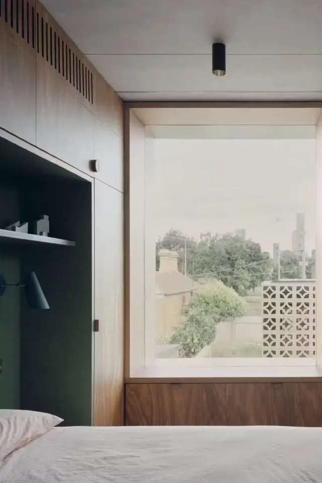 Le bois est omniprésent dans cette extension de maison. On le trouve sous la forme de meubles comme la table de salle à manger mais pas uniquement. Ce matériau que l'on connait tous bien est parfois un composant de mobilier sur-mesure comme la banquette qui offre la possibilité de regarder le patio ou encore le meuble de rangement qui entoure le lit de la chambre parentale. Le bois est aussi un revêtement. Parfois pour le plafond, parfois pour les murs.