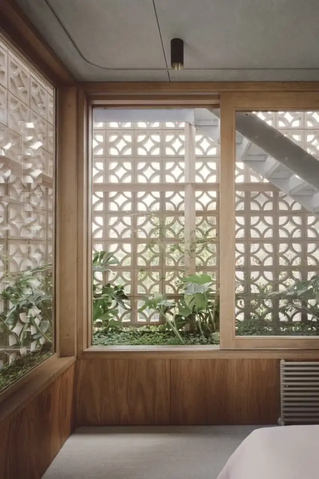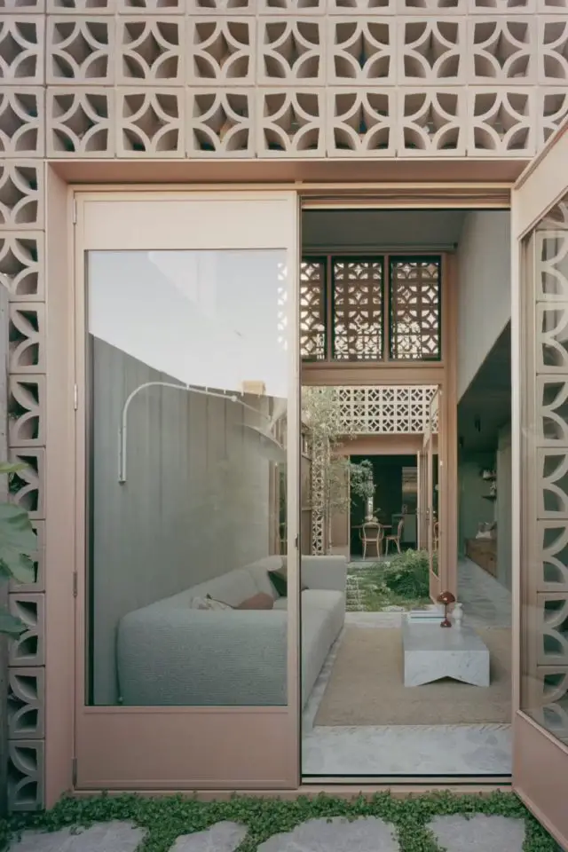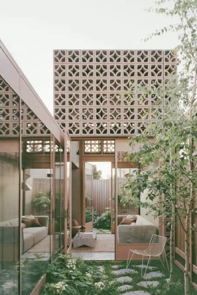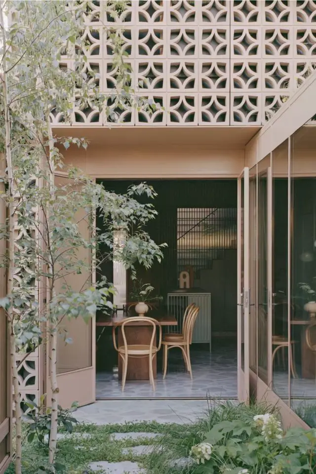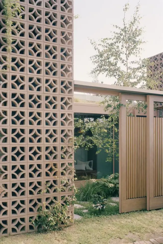C'est assez rare que je prenne le temps de m'attarder sur les extérieurs quand je vous propose des visites déco. Néanmoins, cette fois je fais une exception parce que l'extérieur de cette maison / extension est tout aussi intéressant que l'intérieur (j'en parle après). Quand on fait construire une extension souvent on fait des façades classiques, des murs pleins; Parfois, l'extension est une véranda et dans ce cas, on a essentiellement du verre et du métal. Ici c'est différent. Un soin tout particulier a été porté à l'extérieur de l'extension qui est composé de claustras. En France, quand on utilise des claustras extérieurs, c'est souvent pour créer un mur, pour se protéger des regards des voisins ou des passants dans la rue. Les claustras sont souvent dans la continuité d'un mur plein. Ici, ils sont utilisés de manière différente.