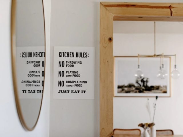 C'est en partie grâce aussi à une deuxième famille d'objets plus modernes et chic. On trouve un peu partout dans cette maison des objets dorés (cache-pots, pied de lampe de chevet, plateau de desserte). On a aussi des objets en rotin et en fibres tressées. Ce sont des objets un peu à part parce que certains vont clairement renvoyer au style vintage (j'en parle après), alors que d'autres vont être associés à notre époque actuelle. C'est le cas par exemple avec la suspension dans le salon séjour. Toujours bien ancré dans le présent, on peut regarder du côté des cadres. Il y a de nombreuses affiches, avec une typo simple, un message personnel, un encadrement minimal et moderne.