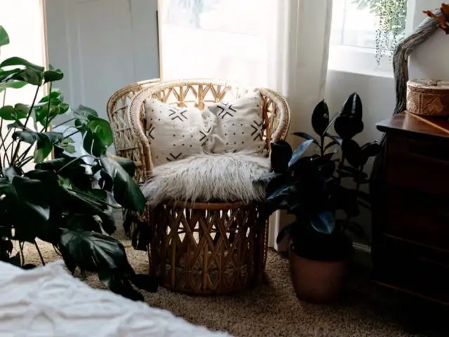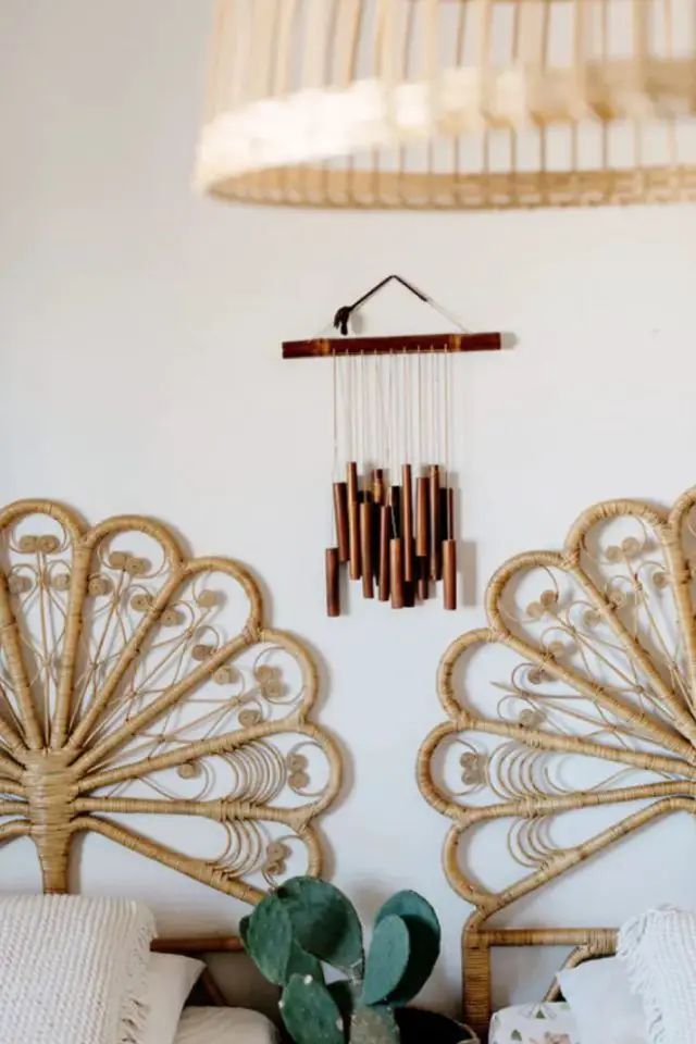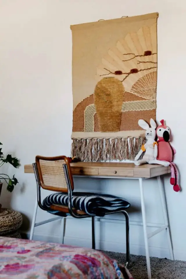 Les années 70 ne sont pas juste un mélange de couleurs comme le orange, le marron, le jaune, qu'on peut associer à la période disco (la déco et la musique sont souvent associées dans mon esprit...) On a aussi toute l'époque hippie. Un mouvement né au milieu des années 60 et qui a perduré dans la décennie suivante. Ce n'est pas pour rien que le style bohème et la tendance hippie chic sont souvent associés. Il y a certaines pièces de mobilier dans cette maison qui font clairement référence à ce mouvement hippie et à cette période de l'histoire. On a par exemple les têtes de lit jumeaux en fibres tressées, le fauteuil de la chambre parentale en vannerie lui aussi.