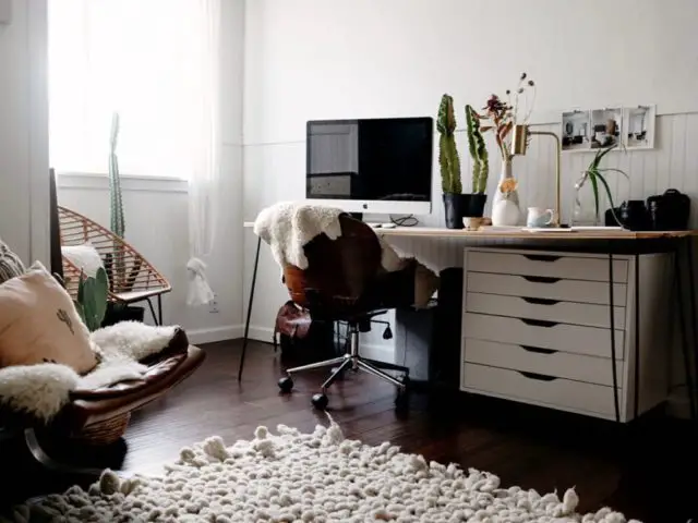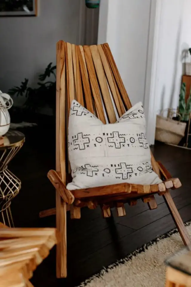Quels sont justement ces objets qui personnalisent cet intérieur? On peut les classer par styles. D'abord, il y a foule d'objets relatifs au style bohème. On va trouver des objets textiles comme le fameux tapis berbère, les coussins aux imprimés ethniques, de la fausse fourrure qui apporte une touche plus cosy. Il y a aussi tout le pendant décoration murale qui renvoie directement à la déco boho: une tenture en macramé, des crânes d'animaux, des colliers, un chapeau, du bois flottés ramené de voyage, un carillon en bois... Je ne suis pas la première des fans du style bohème, je ne l'ai jamais caché. Cependant ici, il y a une juste mesure. Ni trop, ni trop peu.