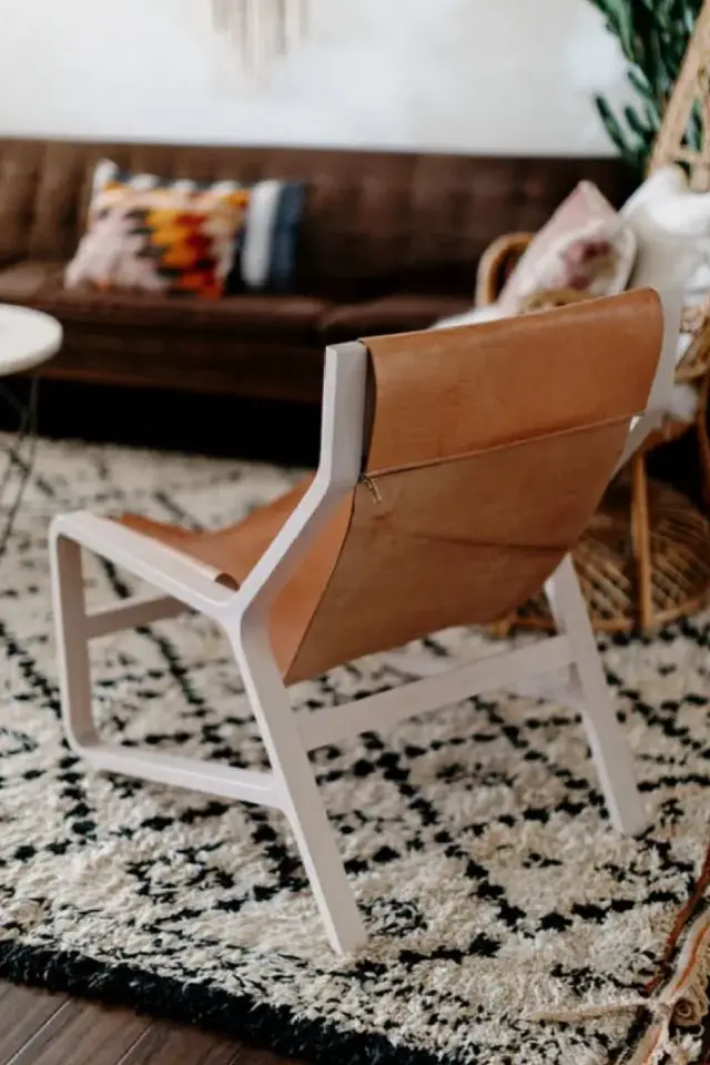 La chaise Cesca n'est pas le seul meuble mid century modern dans cette maison. On peut voir des meubles en bois sombre notamment la commode de la chambre parentale, le meuble télé dans le salon. Les différentes assises du séjour ont elles aussi un look vintage même si la plus marquée est le fauteuil Eames en cuir avec son ottoman.