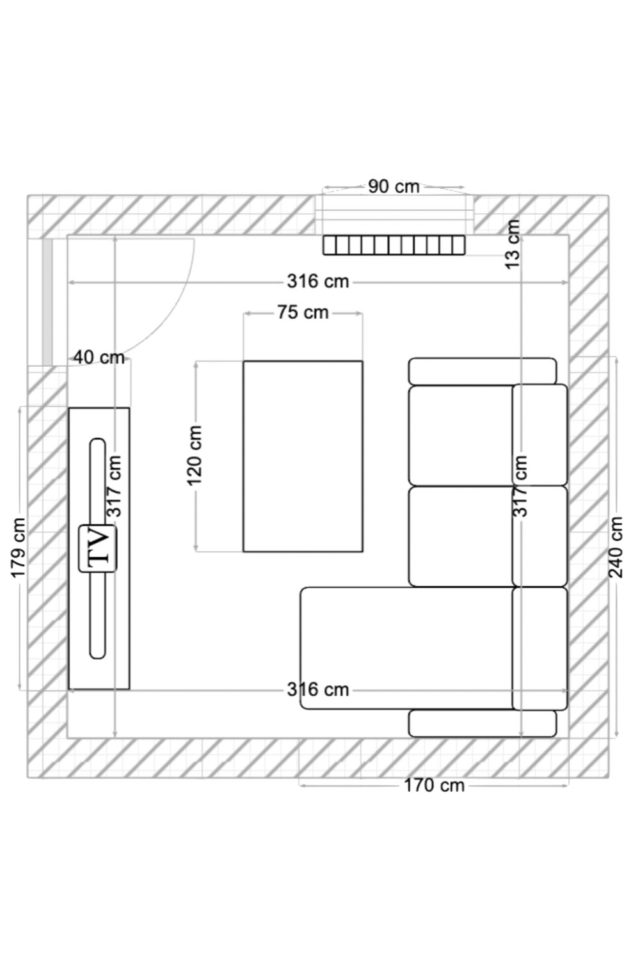 J'ai choisi de mettre une porte qui s'ouvre vers l'intérieur, une à deux fenêtres doubles avec des radiateurs en dessous. C'est généralement comme cela que ça se présente. La taille des meubles est indiquée sur au moins un plan pour chaque forme de salon. Et si ce n'est pas indiqué sur le plan et que la taille diffère des autres plans, je le préciserai.