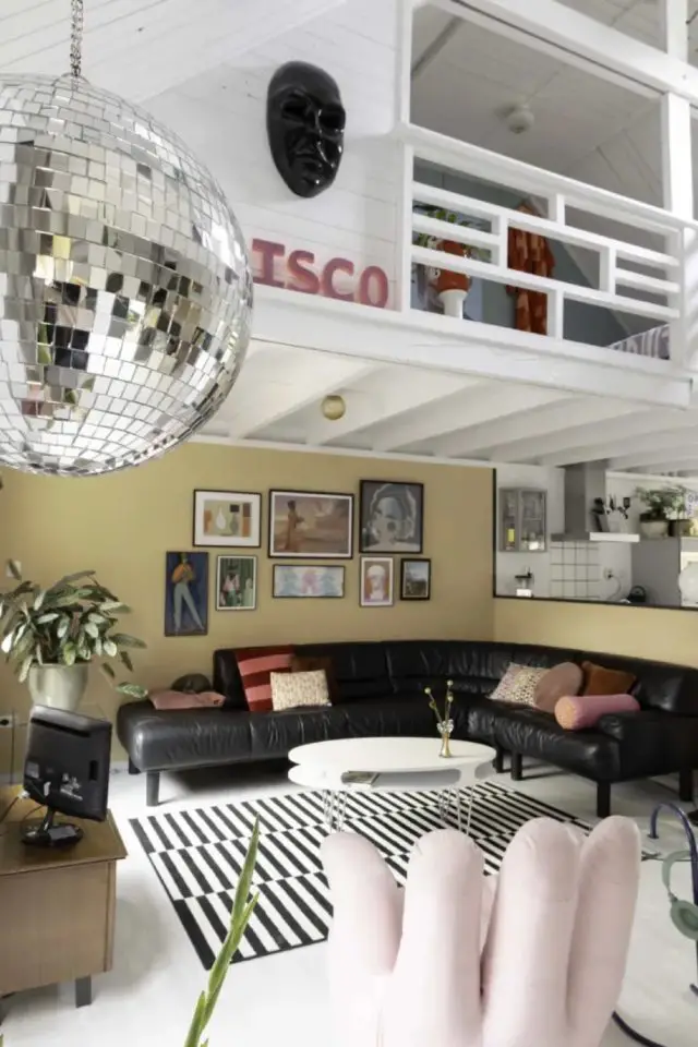 Ici, les différentes époques vivent ensemble pour créer un décor unique et personnel. Les années 20 côtoient les années 80 mais aussi des choses neuves comme des étagères ou des rideaux qui viennent de chez Ikea. Il y a aussi des objets design qui ont un fort pouvoir décoratif. C'est le cas pour le fauteuil main au coeur de la pièce, la boule à facettes, un lettrage vintage posé au dessus du salon. Il n'est pas nécessaire d'avoir beaucoup de pièces déco ou de mobilier quand certains éléments sont très visuels et originaux. J'avoue, je suis fan des jambes de mannequin de magasin qui sont posées sur le buffet aux formes arrondies. Je sais que tout le monde n'oserait pas mais j'aime ce côté inattendu, surprenant.
