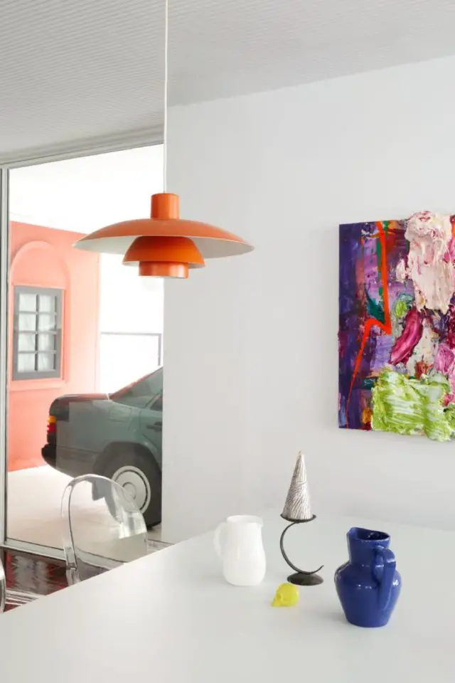 visite maison moderne touche artistique salle à manger mélange moderne et ancien chaise en rotin suspension design vintage tableau contemporain artiste thaïlandais