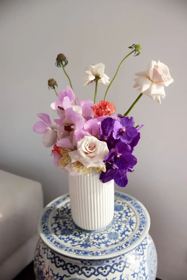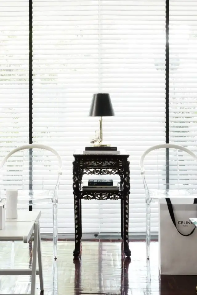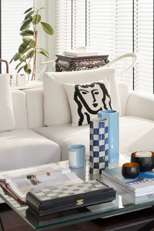 On trouve aussi divers objets décoratifs actuels: vase strié, vase à motif de damier, vase noir et blanc tout en rondeur, carafe bleu électrique, des piles de livres / magazines pour donner du volume à la table basse... De petites touches décoratives qui accentuent le clin d'oeil au design contemporain et qui apportent de la vitalité à un intérieur majoritairement blanc.