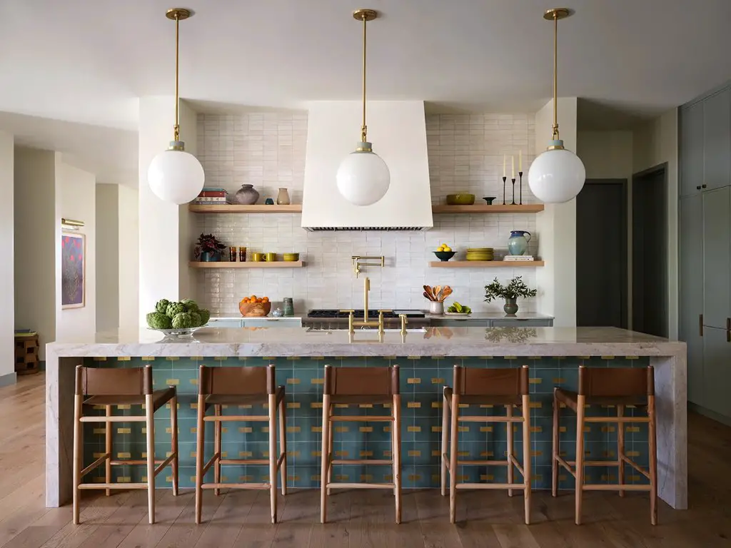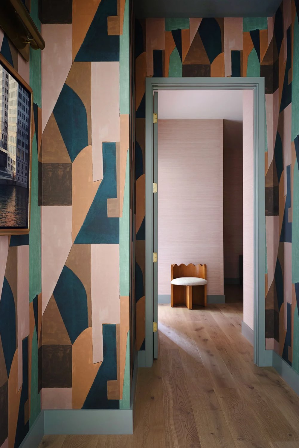 Les couleurs chaleureuses jouent aussi un rôle dans cette quête d'un intérieur plus cosy. En général, quand on souhaite créer un décor chaleureux, on se penche sur une palette de couleurs neutres. Ce n'est pas le cas ici. Les neutres comme on a pu le voir précédemment sont plus synonyme de modernité. Ici, ce sont des couleurs actuelles qui créent un univers vivant et familial. Le jaune des chaises qui contraste avec le gris des murs. Le vert en contrebas de l'îlot de cuisine associé au cuir naturel des chaises, le bleu sarcelle d'une des salles de bain, le vert et le blanc rosé de l'autre. Le clou de la couleur qui crée un sentiment confortable ici c'est le papier peint cubiste dans le vestibule. L'imprimé peut faire référence à la modernité, les couleurs aussi mais avant tout, elles créent un sentiment chaleureux et enveloppant.