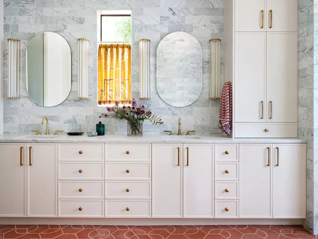 L'arrondi est quelque chose d'actuel. On n'est pas ici dans un intérieur 100% bold composé uniquement de courbes. Néanmoins, elles sont belles et bien présentes: la table basse et le bout de canapé dont je parlais juste avant, la table de salle à manger, le dossier des chaises qui l'entourent. Dans les pièces d'eau on a des miroirs arrondis, une vasque ovale. Et l'arrondi est intéressant dans notre question d'équilibre puisqu'il crée un décor moderne tout en contribuant à l'esprit de confort. L'arrondi est féminin, enveloppant.
