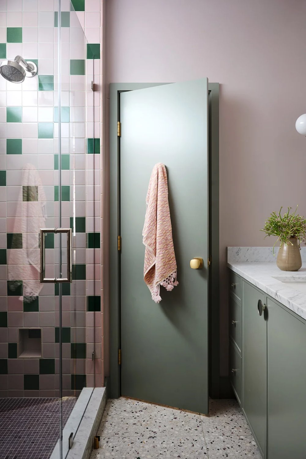 Regardons maintenant les revêtements muraux. Dans la partie précédente, j'ai évoqué la peinture blanche du salon, l'effet béton ciré gris anthracite de l'espace salle à manger. J'ai évoqué vite fait une partie du revêtement de l'îlot de cuisine: des carreaux de béton vert avec des détails en laiton qui offrent beaucoup d'élégance à l'ensemble de la pièce qui est très clair et au final assez sobre). Je vous ai parlé aussi du papier peint dans le vestibule. On peut regarder du côté de la chambre, c'est un papier légèrement texturé et rose poudré, parfaitement cosy. Les 3 salles de bain offrent aussi tout un lot de revêtement muraux. Dans la salle de bain parentale, les couleurs sont neutres, un carrelage qui imite le marbre. Dans la douche des enfants, c'est un carrelage plus fantaisiste associant quelques carreaux verts à des carreaux neutres de même format. Et dans la 3ème salle de bain, comment ne pas tomber sous le charmes des carreaux hexagonaux sarcelle avec un motif lui aussi hexagonal blanc. J'aime aussi beaucoup le contraste avec la douche qui est dans une couleur complémentaire, un terracotta chaleureux et élégant.