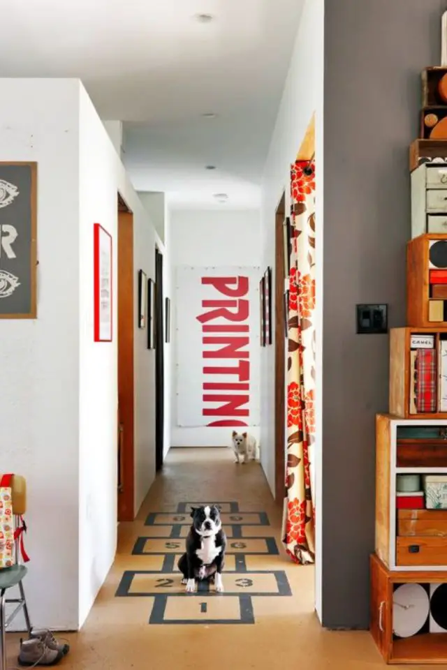 On change de forme de pièce avec une entrée couloir - toujours de 3m2. En plus d'être un passage étroit, il y a souvent plusieurs portes et plusieurs pièces desservies par ce couloir.