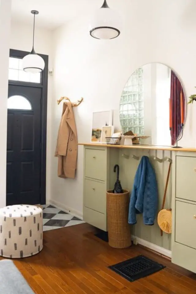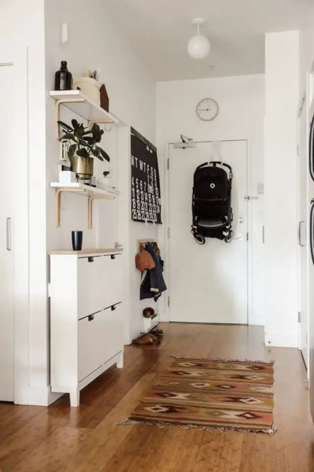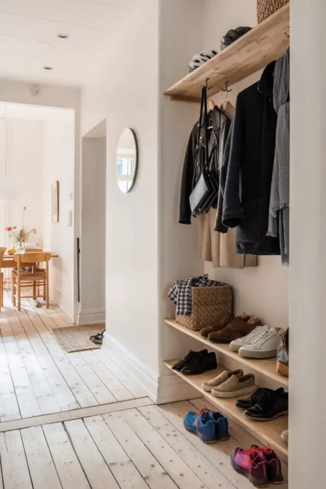 J'ai d'abord placé le porte-manteau à côté de la porte d'entrée pour deux raisons. La première est pratique: en général, on retire son manteau avant de retirer ses chaussures et de les ranger. La seconde est esthétique, en rentrant dans la pièce, vous aurez un sentiment qu'elle est plus dégagée en voyant le meuble à chaussure dans "le fond". Si vous placez des étagères au dessus du meuble à chaussures, faites en sorte de ne pas en mettre de trop et de ne pas les encombrer pour garder un sentiment de légèreté.