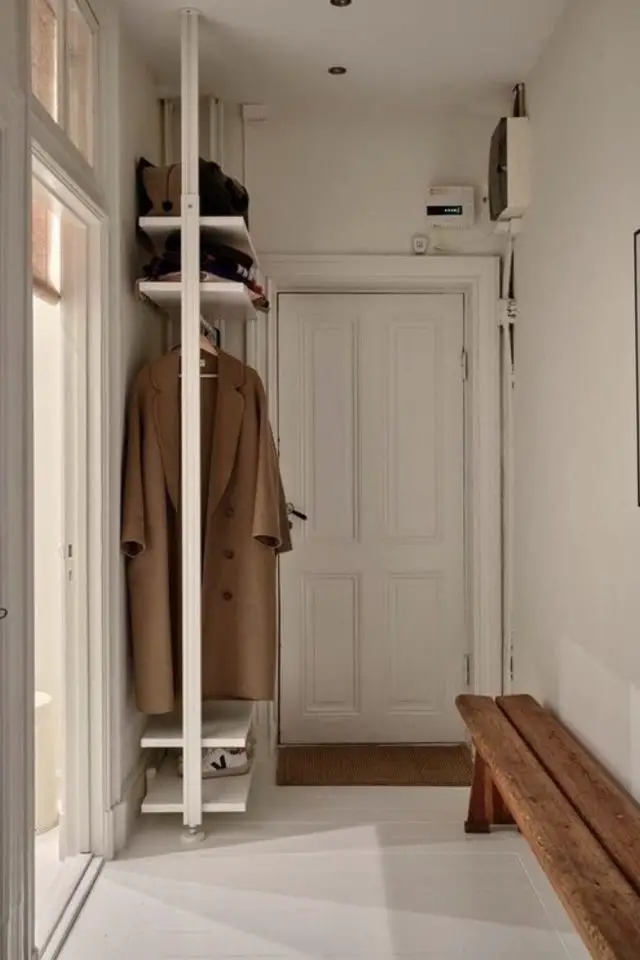 Encore une fois, il est préférable de choisir une solution murale pour ranger les manteau. C'est une alternative moins encombrante et dans ce cas, on peut placer d'abord les patères puis le meuble de rangement pour les chaussures. Ce sera plus agréable quand vous regarderez l'entrée depuis votre pièce de vie.