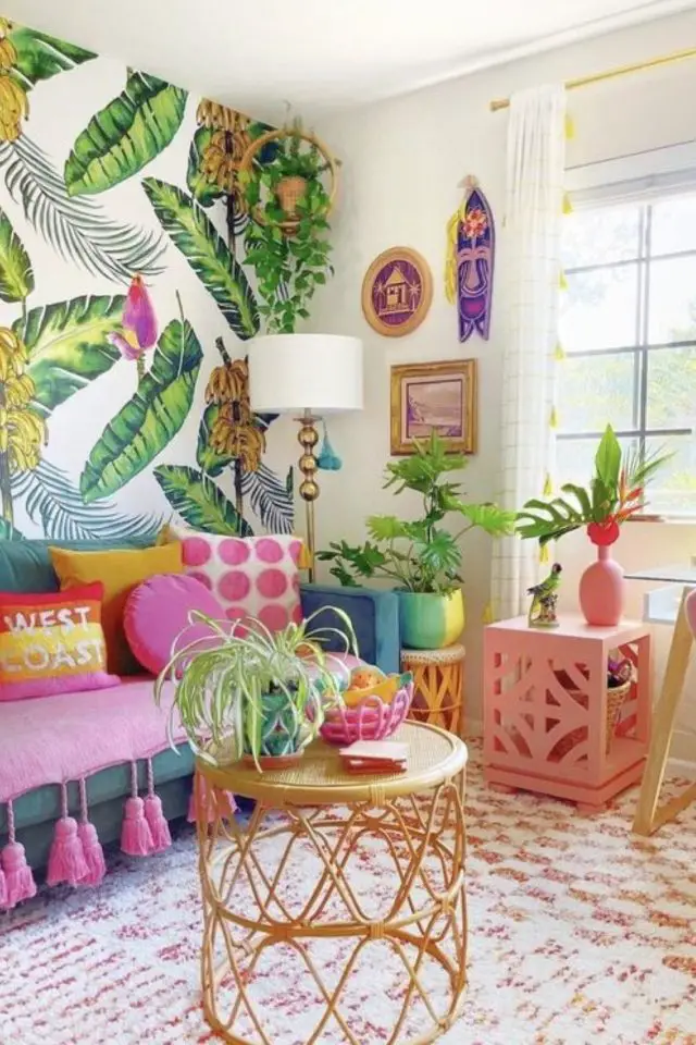 Le rose et le vert sont deux couleurs complémentaires qui s'associent à merveille même si ici on va plus être sur une couleur néon plus qu'un rose pâle (à la Pantone 2024). La fleur d'hibiscus peut se décliner en motif pour le papier peint mais aussi les textiles comme les housses de coussins dans le canapé. Et pour les plus gourmand(e)s, je vous invite à essayer l'infusion ou le sirop d'hibiscus, c'est délicieux!