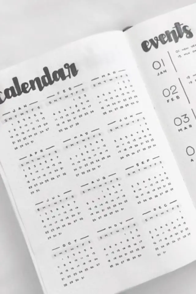 Normalement, chaque bullet journal commence par un index. Vous pouvez aussi ajouter un calendrier à l'année pour noter les événements importants comme les anniversaires, les dates de vacances, etc. C'est pratique pour voir en un clin d'oeil ce qu'il ne faut pas oublier. Ensuite, il y a le calendrier du mois où on reporte les dates importantes puis le calendrier journalier. Souvent, pour le samedi et dimanche, on utilise moins de place... Mais si vous avez des week-ends chargés, ce n'est peut-être pas une bonne idée.