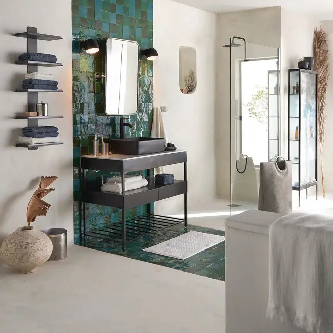 Plus discret encore, le chrome s'invite dans l'encadrement de miroir. Après le bois, le noir, c'est le chrome qui vient encadrer les miroirs. Comme un effet de ton sur ton, il se fait oublier juste à côté de la surface miroir.