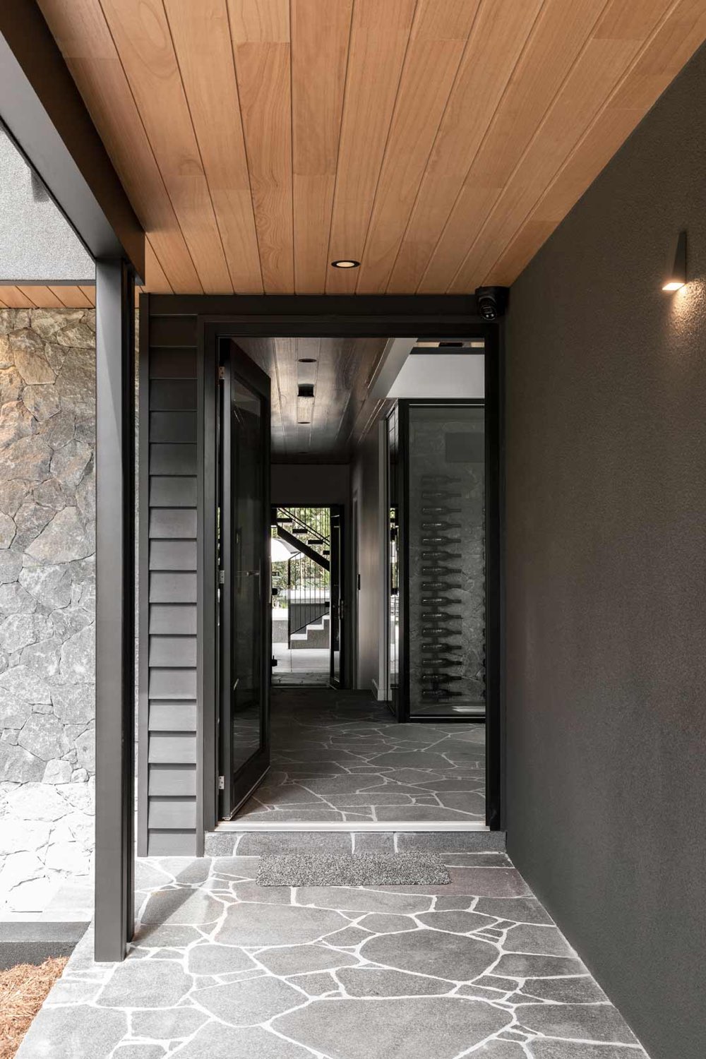 Du bois, de la pierre, du noir... Une palette de matériaux et de couleurs assez simple. C'est leur utilisation, leur emplacement qui font que cette vaste demeure minimale semble chaleureuse et élégante.