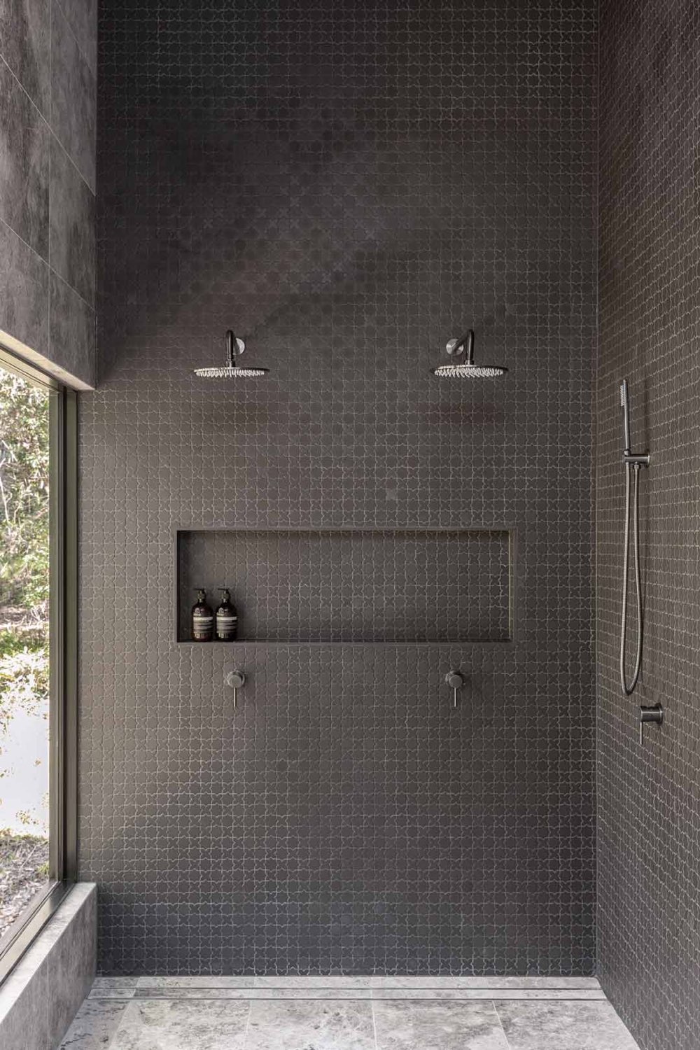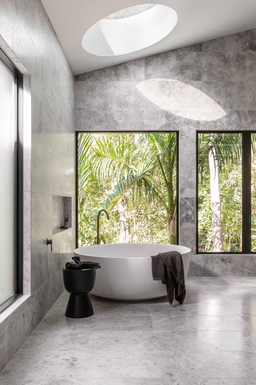 Cependant, ce qui est séduisant va plus loin que juste une apparence générale. Il y a une harmonie entre les volumes, les espaces et le minimalisme. Le minimalisme n'est pas une absence, un vide. C'est une autre démarche. On s'intéresse à autre chose. Etre entouré(e) d'objets n'a pas une place de premier plan ici. Le minimalisme permet de nous entourer de beaux matériaux (ça, on l'a vu plus haut) mais surtout de lumière. J'ai évoqué les grandes baies vitrées qui effacent la séparation entre l'intérieur et l'extérieur. On a aussi des puits de lumières notamment dans les salles de bain qui permettent de profiter pleinement de la luminosité extérieure. Le verre et la transparence sont des thématiques importantes dans l'architecture et l'appréhension de l'intérieur dans le mouvement mid century modern et plus largement dans le modernisme. Il efface les cloisons, il permet de conserver les espaces. On le voit par exemple avec la douche qui a une paroi vitrée minimale qui protège mais qui se fait totalement oublier visuellement.