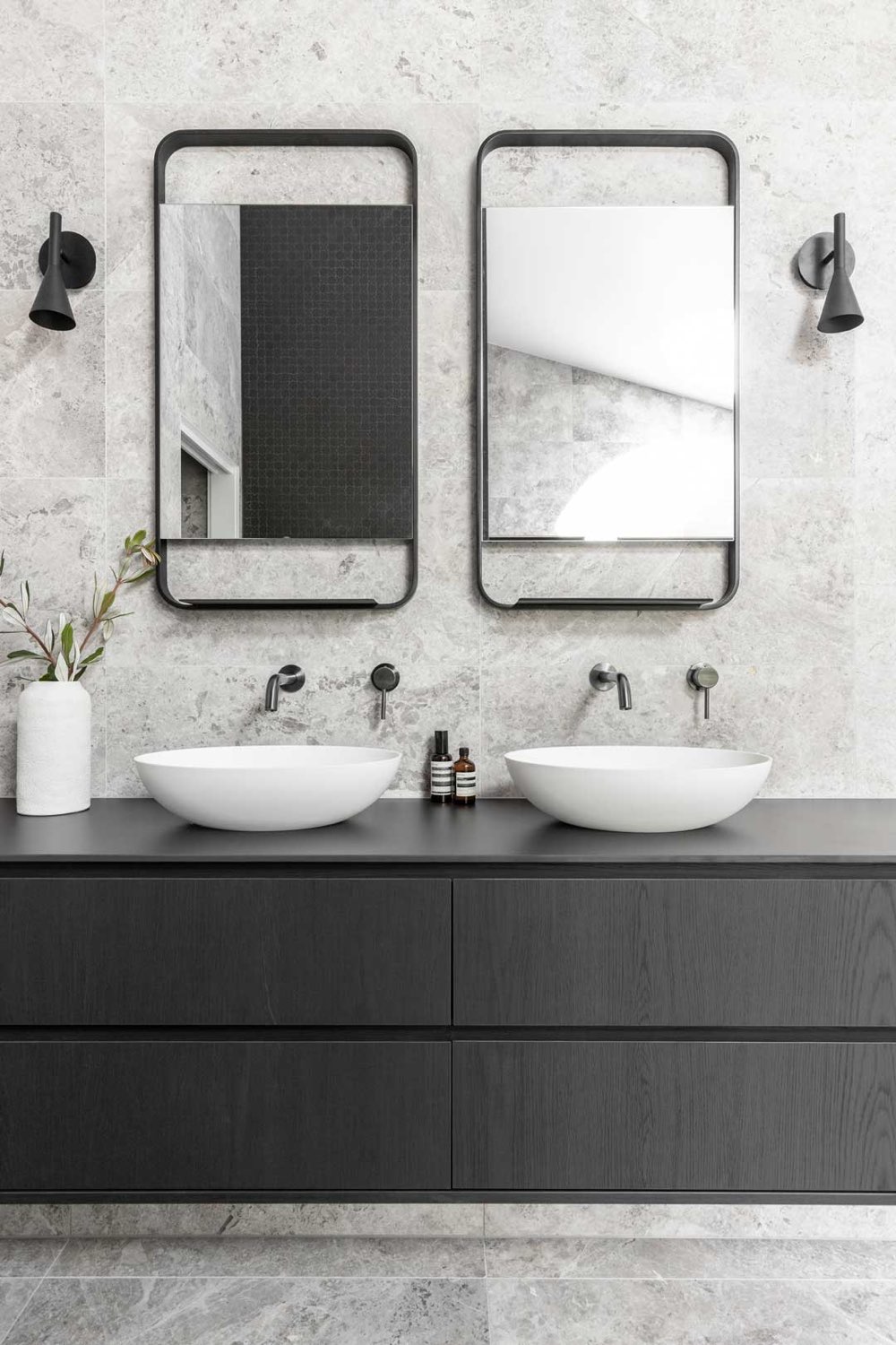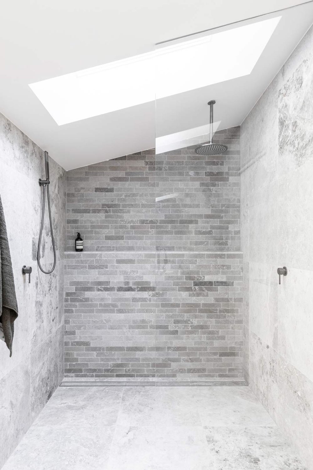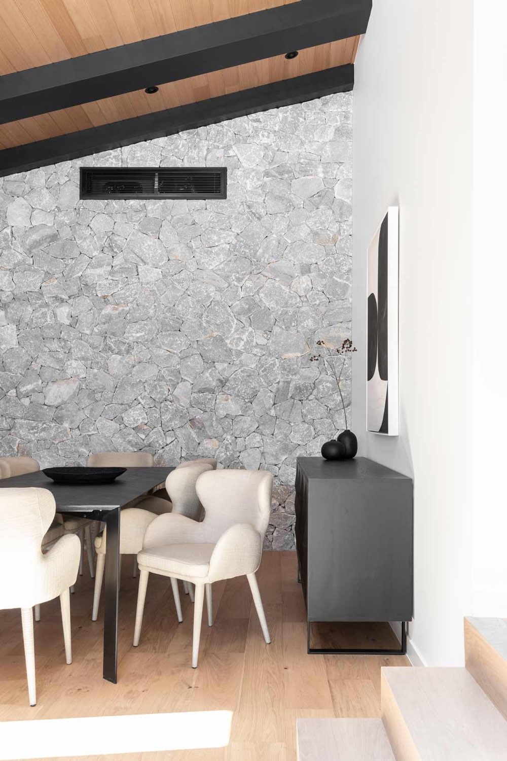 Et puis, il y a la pierre. Elle recouvre le mur impressionnant de la cheminée et ce matériau offre une place extraordinaire au foyer. Il a certes une apparence minimale et épurée mais la pierre grise lui offre un caractère fort, robuste et puissant. La pierre est également dans l'espace salle à manger, un mur accent qui fait écho au revêtement de la cheminée. La pierre se retrouve ailleurs: Le revêtement de sol qui mène à l'escalier avec une pierre plus sombre et un jointage plus espacé. Dans les salles de bain aussi. On garde un esprit minéral avec des revêtements marbrés - en gris eux aussi. Dans l'une des douches un carrelage esprit métro juste pour la forme. Ils font aussi partie de cette palette monochrome de gris pierre.
