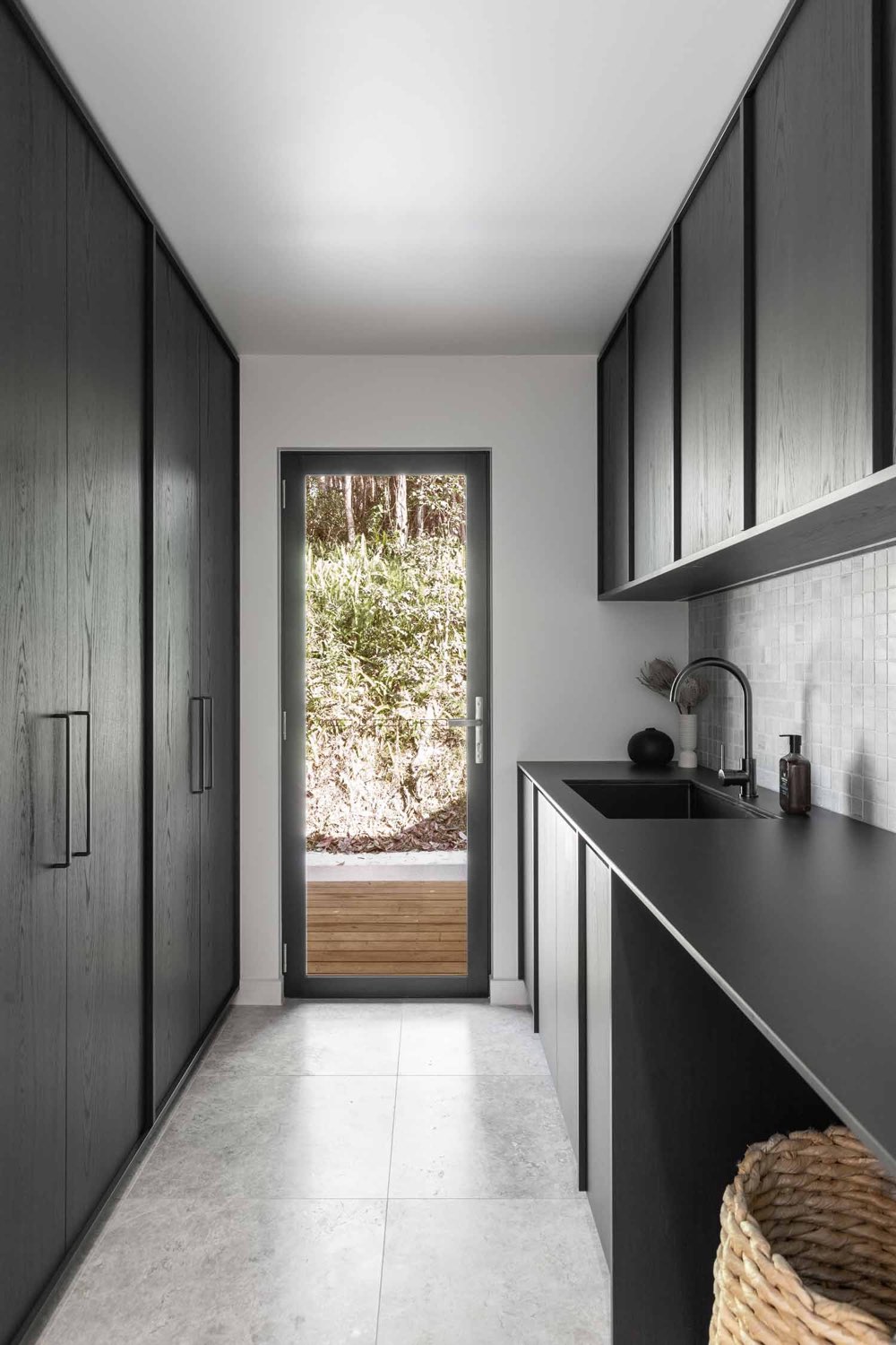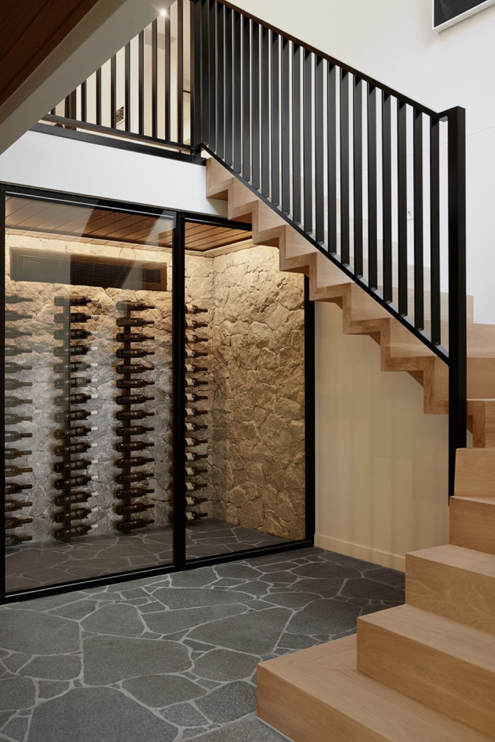 Dans ce vaste lodge, tous les espaces ont été pensés avec soin. C'est peut-être ça le luxe... avoir un intérieur où tout est à sa place (et je ne parle pas que de rangement ici). Avoir le luxe d'aménager et d'optimiser tous les espaces comme ici la cave à vin vitrée en dessous de l'escalier ou encore la buanderie toute en longueur qui s'ouvre sur l'extérieur par une porte simple mais vitrée.